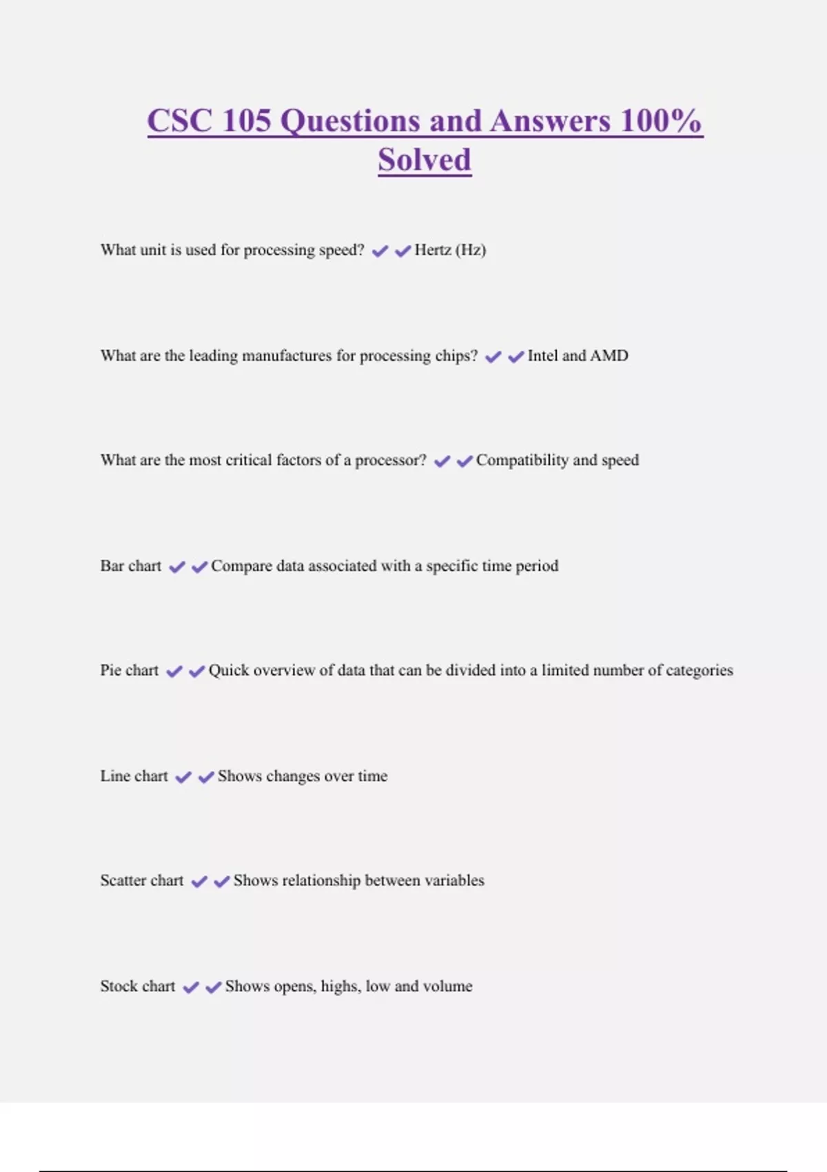 CSC 105 Questions and Answers 100% Solved What unit is used for processing speed? Hertz (Hz) What are the leading manufactures for processing chips? Intel and AMD What are the most critical factors of a processor? Compatibility and speed Bar chart Compare data associated with a specific time period