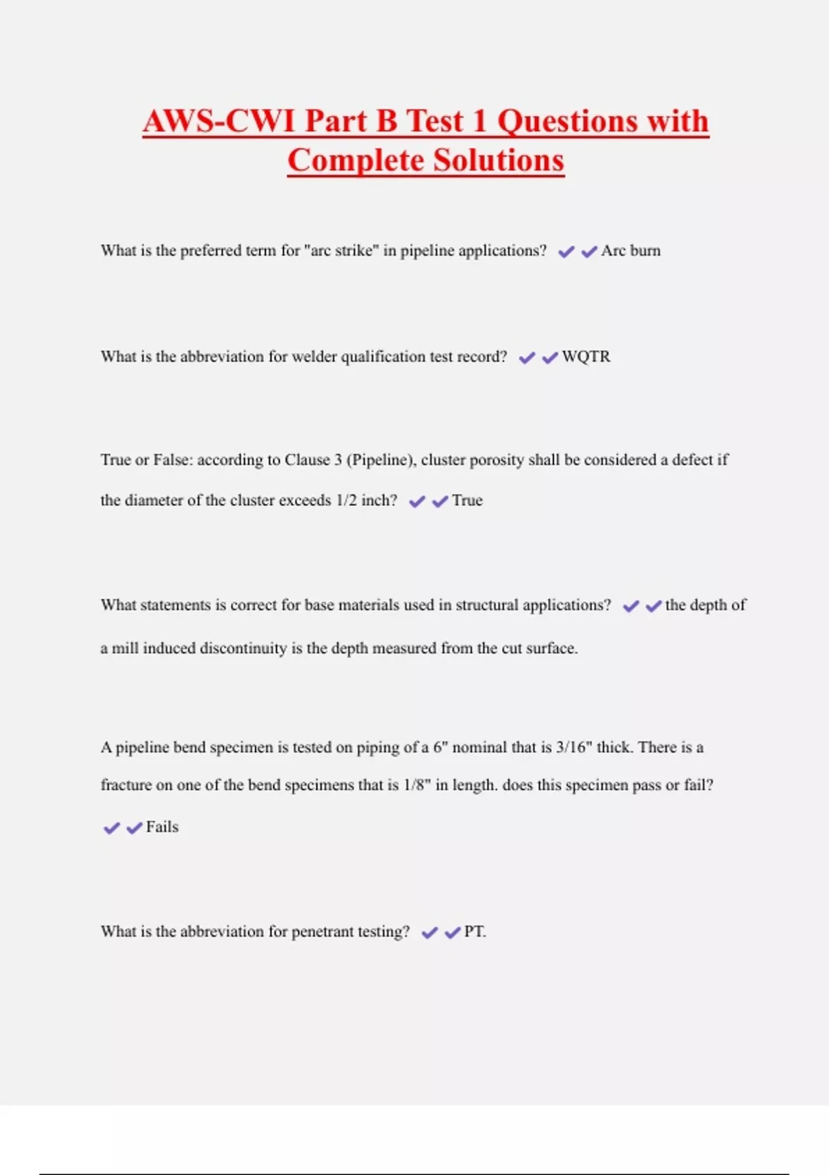 AWS-CWI Part B Test 1 Questions with Complete Solutions What is the preferred term for "arc strike" in pipeline applications? Arc burn What is the abbreviation for welder qualification test record? WQTR True or False: according to Clause 3 (Pipeline), cluster porosity shall be considered a defect if the diameter of the cluster exceeds 1/2 inch? True