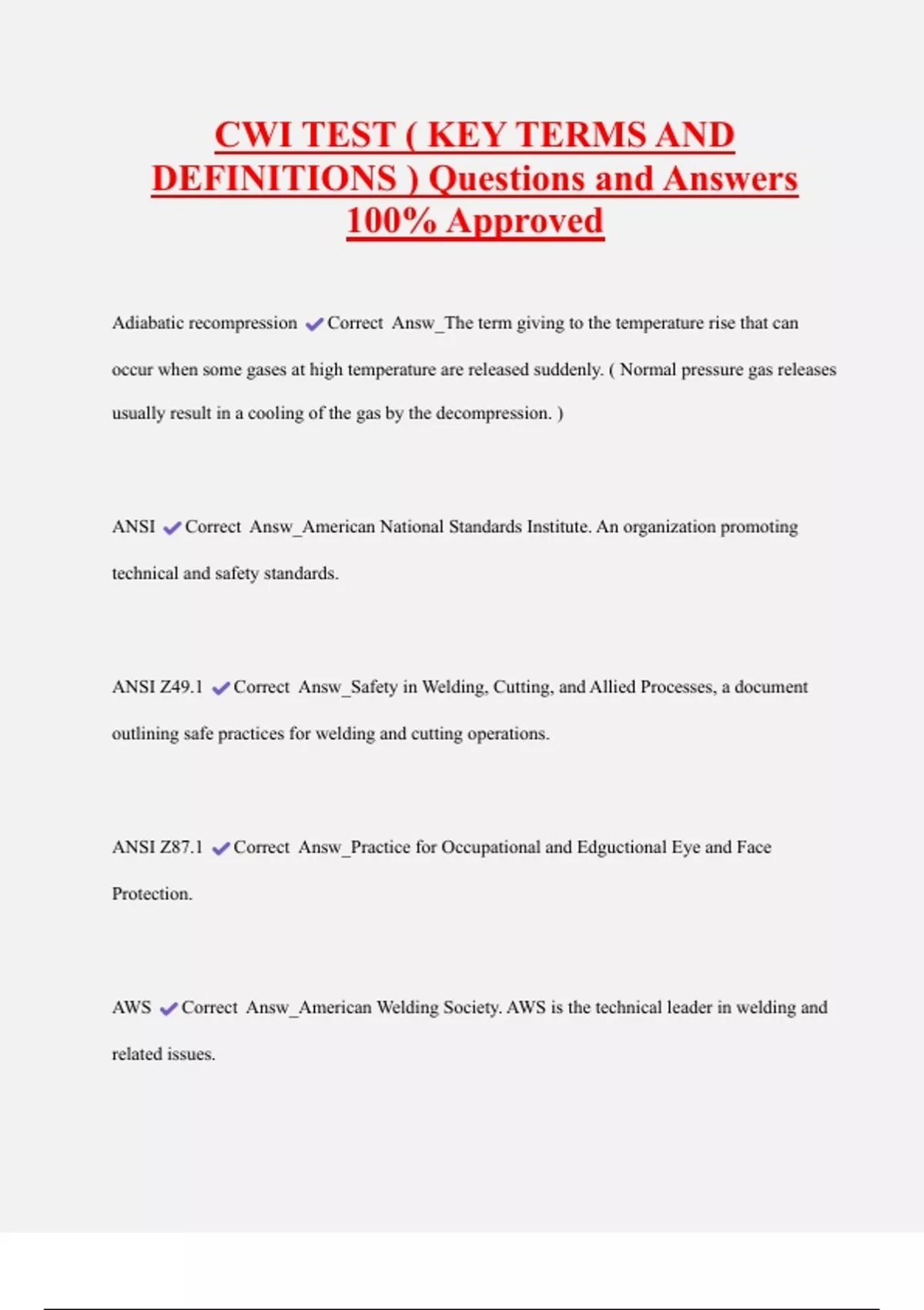 CWI TEST ( KEY TERMS AND DEFINITIONS ) Questions and Answers 100% Approved Adiabatic recompression Correct Answ_The term giving to the temperature rise that can occur when some gases at high temperature are released suddenly. ( Normal pressure gas releases usually result in a cooling of the gas by the decompression. ) ANSI Correct Answ_American National Standards Institute. An organization promoting technical and safety standards