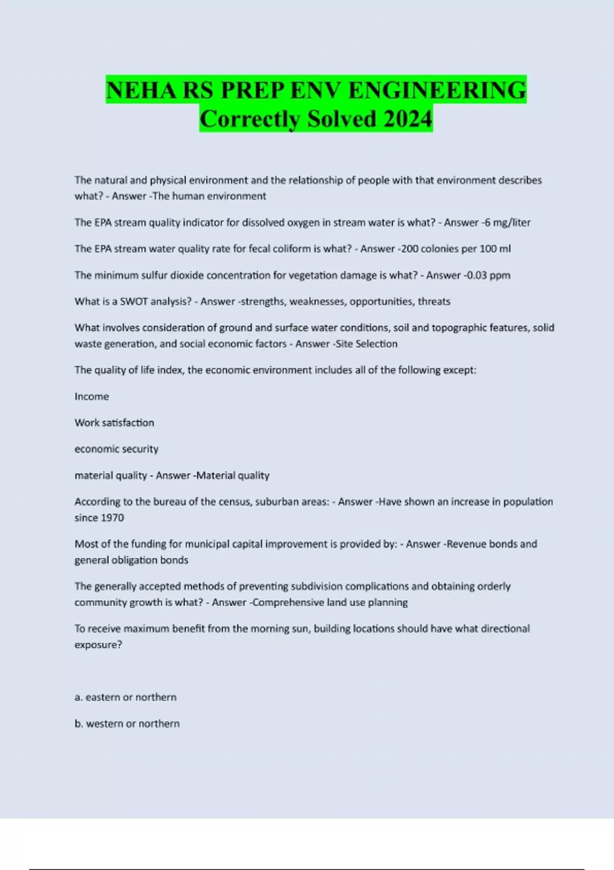 NEHA RS PREP ENV ENGINEERING Correctly Solved 2024 The natural and physical environment and the relationship of people with that environment describes what? - Answer -The human environment The EPA stream quality indicator for dissolved oxygen in stream water is what? - Answer -6 mg/liter The EPA stream water quality rate for fecal coliform is what? - Answer -200 colonies per 100 ml The minimum sulfur dioxide concentration for vegetation damage is what? - Answer -0.03 ppm What is a SWOT analysis? - Answer -strengths, weaknesses, opportunities, threats What involves consideration of ground and surface water conditions, soil and topographic features, solid waste generation, and social economic factors - Answer -Site Selection The quality of life index, the economic environment includes all of the following except: Income Work satisfaction economic security material quality - Answer -Material quality According to the bureau of the census, suburban areas: - Answer -Have shown an increase in population since 1970 Most of the funding for municipal capital improvement is provided by: - Answer -Revenue bonds and general obligation bonds The generally accepted methods of preventing subdivision complications and obtaining orderly community growth is what? - Answer -Comprehensive land use planning To receive maximum benefit from the morning sun, building locations should have what directional exposure? a. eastern or northern b. western or northernc. western or southern d. eastern or southern - Answer -Eastern or Southern When developing a preliminary or feasibility report, what step is not generally included? Environmental impact study Cost estimates Construction plans Methods of financing - Answer -Construction plans The ideal comprehensive regional plan would be one that combines what? - Answer -All the project physical planning studies of a comprehensive economic and social development plan What is a GAP analysis? - Answer -An analysis of the distance between the current state and the future state What is the smallest practical planning unit involved in regional planning? - Answer -The county A comprehensive water supply study must include what? - Answer -Alternative sources of water In research and problem identification, the evaluation of the community contains all of the following except what: Transportation systems Population and demographic studies special planning studies economic studies and proposals - Answer -Special planning studies Comprehensive community planning is also referred to as what? - Answer -General planning A comprehensive solid waste study must include what? - Answer -A preliminary analysis for solid waste treatment and disposal One method of financing for a municipal capital improvement is by revenue bonds which in turn are paid by who? - Answer -Persons receiving the service True or False: Financing for municipal capital improvements is generally done by revenue bonds or general obligation bonds? - Answer -True Stakeholder focused interactive strategic planning makes the assumption that stakeholders must do what? - Answer -Like the organization doing the planningThe selection of a site for a public building often requires improvements. An undesirable feature that can often be remediated for public health reasons concerns is: - Answer -A low swampy area Communities that desire to maintain the character of the community without overtaxing its members should do what? - Answer -Develop zoning regulations and encourage the development of vacant land served by existing public services