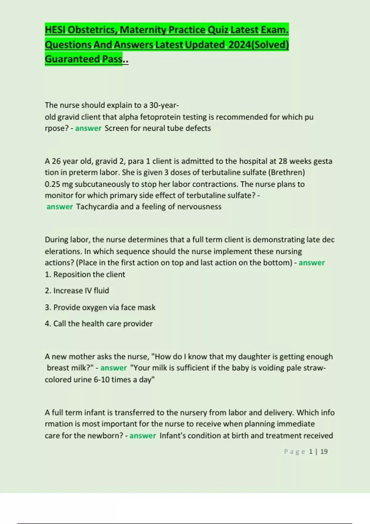 HESI Obstetrics, Maternity Practice Quiz Latest Exam.