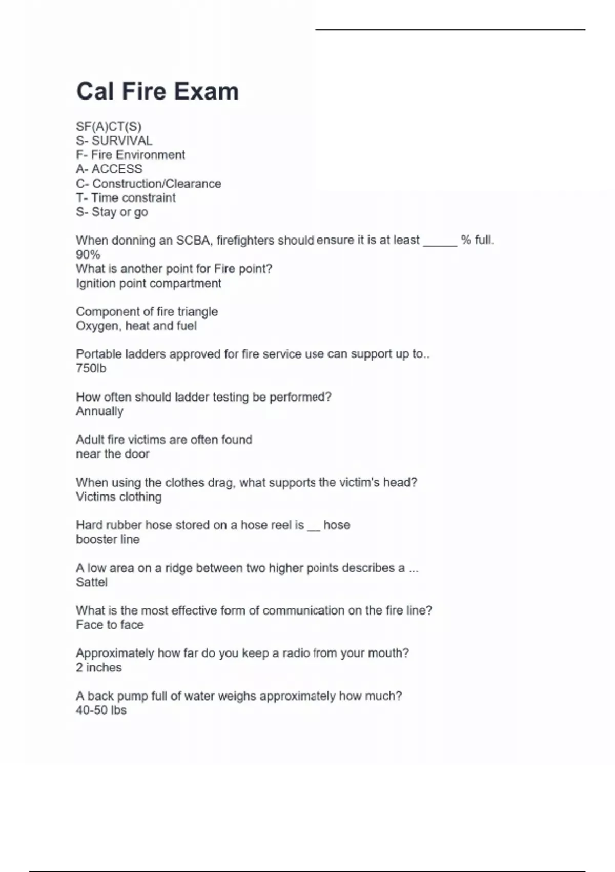 Cal Fire Exam SF(A)CT(S) S- SURVIVAL F- Fire Environment A- ACCESS C- Construction/Clearance T- Time constraint S- Stay or go When donning an SCBA, firefighters should ensure it is at least _____ % full. 90% What is another point for Fire point? Ignition point compartment Component of fire triangle Oxygen, heat and fuel Portable ladders approved for fire service use can support up to.. 750lb How often should ladder testing be performed? Annually Adult fire victims are often found near the door When using the clothes drag, what supports the victim's head? Victims clothing Hard rubber hose stored on a hose reel is __ hose booster line A low area on a ridge between two higher points describes a ... Sattel