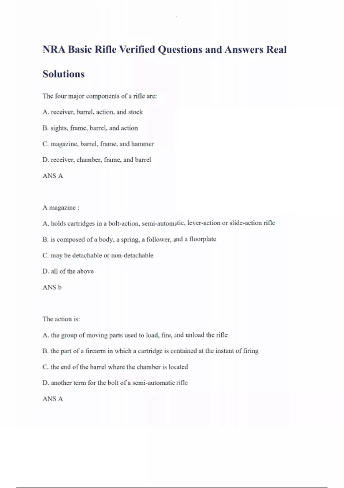 NRA Basic Rifle Verified Questions and Answers Real Solutions The four major components of a rifle are: A. receiver, barrel, action, and stock B. sights, frame, barrel, and action C. magazine, barrel, frame, and hammer D. receiver, chamber, frame, and barrel ANS A A magazine : A. holds cartridges in a bolt-action, semi-automatic, lever-action or slide-action rifle B. is composed of a body, a spring, a follower, and a floorplate C. may be detachable or non-detachable D. all of the above ANS b The action is: A. the group of moving parts used to load, fire, and unload the rifle B. the part of a firearm in which a cartridge is contained at the instant of firing C. the end of the barrel where the chamber is located D. another term for the bolt of a semi-automatic rifle ANS A