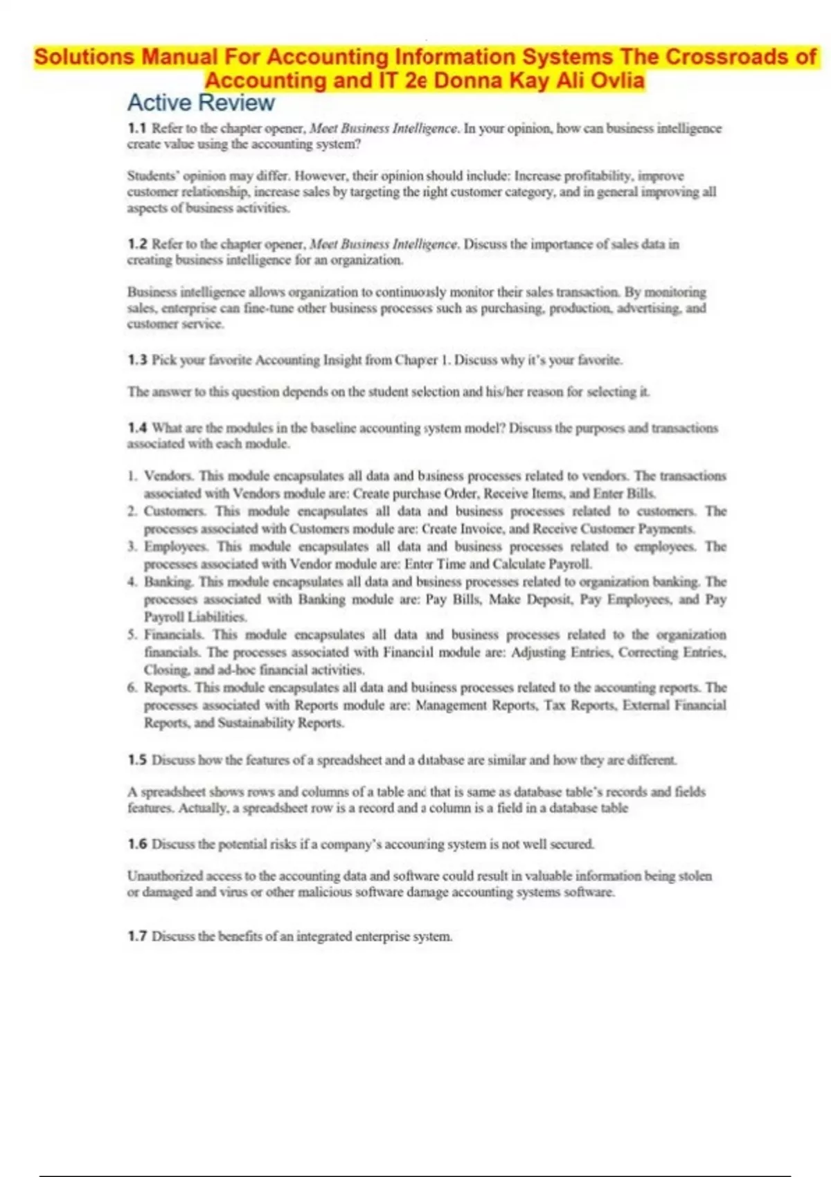 Solutions Manual For Accounting Information Systems The Crossroads of Accounting and IT 2e Donna Kay Ali Ovlia-1.1 Refer to the chapter opener, Meet Business Intelligence. In your opinion, how can business intelligence create value using the accounting system? Students’ opinion may differ. However, their opinion should include: Increase profitability, improve customer relationship, increase sales by targeting the right customer category, and in general improving all aspects of business activities. 1.2 Refer to the chapter opener, Meet Business Intelligence. Discuss the importance of sales data in creating business intelligence for an organization. Business intelligence allows organization to continuously monitor their sales transaction. By monitoring sales, enterprise can fine-tune other business processes such as purchasing, production, advertising, and customer service. 1.3 Pick your favorite Accounting Insight from Chapter 1. Discuss why it’s your favorite. The answer to this question depends on the student selection and his/her reason for selecting it. 1.4 What are the modules in the baseline accounting system model? Discuss the purposes and transactions associated with each module. 1. Vendors. This module encapsulates all data and business processes related to vendors. The transactions associated with Vendors module are: Create purchase Order, Receive Items, and Enter Bills. 2. Customers. This module encapsulates all data and business processes related to customers. The processes associated with Customers module are: Create Invoice, and Receive Customer Payments. 3. Employees. This module encapsulates all data and business processes related to employees. The processes associated with Vendor module are: Enter Time and Calculate Payroll. 4. Banking. This module encapsulates all data and business processes related to organization banking. The processes associated with Banking module are: Pay Bills, Make Deposit, Pay Employees, and Pay Payroll Liabilities. 5. Financials. This module encapsulates all data and business processes related to the organization financials. The processes associated with Financial module are: Adjusting Entries, Correcting Entries, Closing, and ad-hoc financial activities. 6. Reports. This module encapsulates all data and business processes related to the accounting reports. The processes associated with Reports module are: Management Reports, Tax Reports, External Financial Reports, and Sustainability Reports. 1.5 Discuss how the features of a spreadsheet and a database are similar and how they are different. A spreadsheet shows rows and columns of a table and that is same as database table’s records and fields features. Actually, a spreadsheet row is a record and a column is a field in a database table 1.6 Discuss the potential risks if a company’s accounting system is not well secured. Unauthorized access to the accounting data and software could result in valuable information being stolen or damaged and virus or other malicious software damage accounting systems software. 1.7 Discuss the benefits of an integrated enterprise system. An integrated enterprise system allows data to be shared among various enterprise departments. For example, an advertising department can use data collected about sales to cluster customers into categories and target customers-categories with different adverting methods. 1.8 Discuss how value chain activities are related to accounting transaction cycles. The value chain facilitates coordination of activities with suppliers and customers, including purchasing and sales transactions. 1.9 Discuss the significance of information technology to the accounting professional. Today, most accounting systems are computerized systems. These accounting systems are installed on the enterprise computers and used on the enterprise internal networks as well as the Internet. To effectively work with computers and use accounting systems, accountants must know enough about computers and networks to be able to use computerized accounting systems. 1.10 Discuss problems that enterprises may experience with shadow data. Shadow data little or lack of documentation and lack or inadequate security and control are two major problems experienced by enterprises.