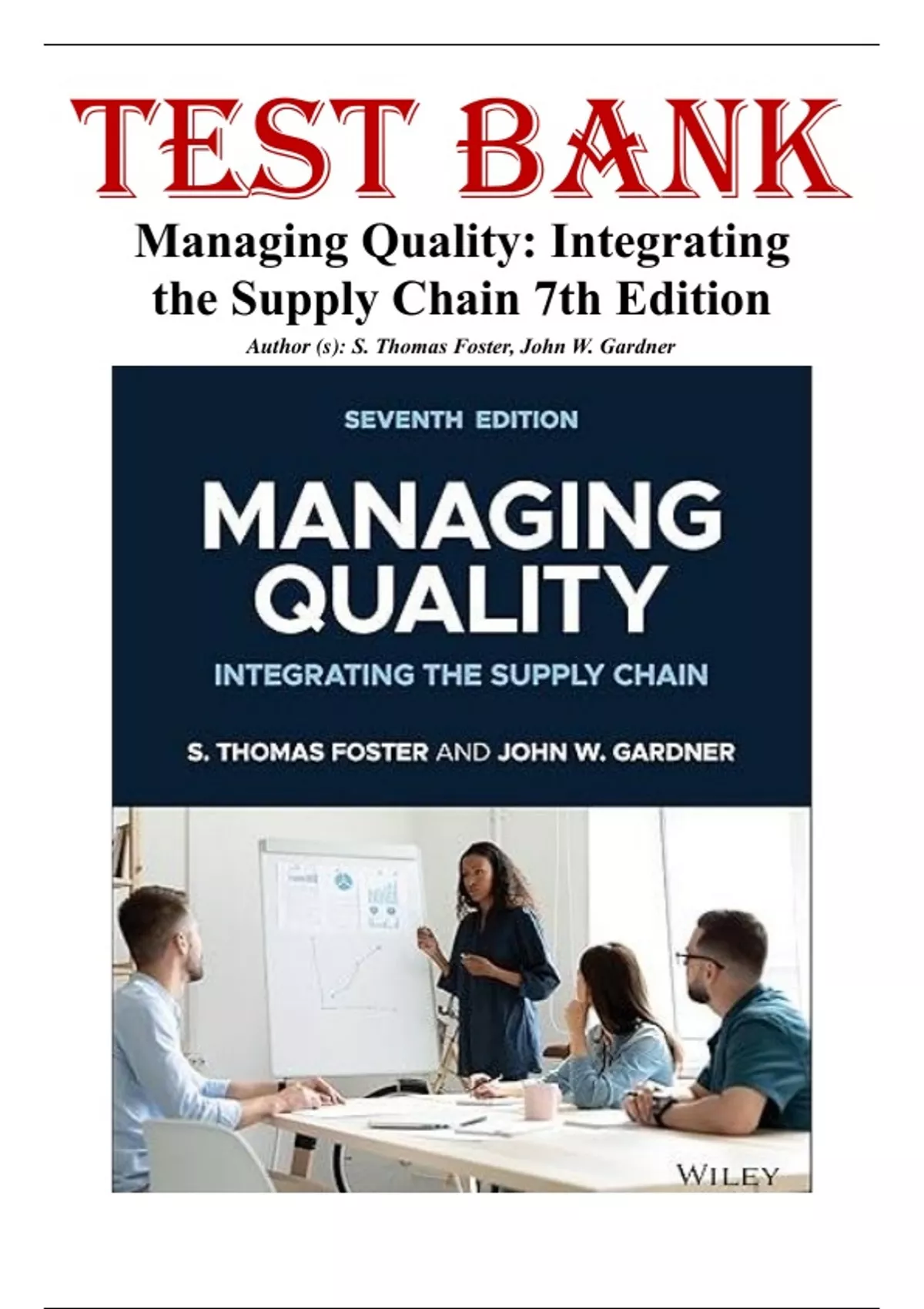 Managing Quality: Integrating the Supply Chain 7th Edition Test bank by Foster . Full Chapters Include;....Part 1 Understanding Quality Concepts 1 Differing Perspectives on Quality 2 2 Quality Theory 27 3 Global Supply Chain Quality and International Quality Standards 53 Part 2 Designing and Assuring Quality 4 Strategic Quality Planning 88 5 The Voice of the Customer 113 6 The Voice of the Market 138 7 Quality and Innovation in Product and Process Design 161 8 Designing Quality Services 189 9 Managing Supplier Quality in the Supply Chain 221 Part 3 Implementing Quality 10 The Tools of Quality 238 11 Statistically Based Quality Improvement for Variables 279 12 Statistically Based Quality Improvement for Attributes 318 13 Lean and Six Sigma Management Principles and Tools 341 Part 4 Forever Improving the Quality System 14 Managing Quality Improvement Teams and Projects 386 15 Implementing and Validating the Quality System
