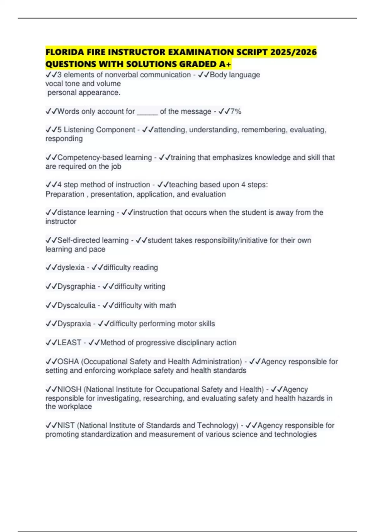 FLORIDA FIRE INSTRUCTOR EXAMINATION SCRIPT 2025/2026 QUESTIONS WITH SOLUTIONS GRADED A+
