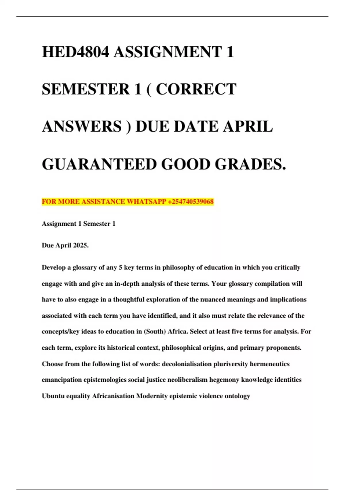 HED4804 ASSIGNMENT 1 SEMESTER 1 ( CORRECT ANSWERS ) DUE DATE APRIL GUARANTEED GOOD GRADES. FOR MORE ASSISTANCE +.2.5.4.7.4.0.5.3.9.0.6.8 Assignment 1 Semester 1 Due April 2025. Develop a glossary of any 5 key terms in philosophy of education in which you critically engage with and give an in-depth analysis of these terms. Your glossary compilation will have to also engage in a thoughtful exploration of the nuanced meanings and implications associated with each term you have identified, and it also must relate the relevance of the concepts/key ideas to education in (South) Africa. Select at least five terms for analysis. For each term, explore its historical context, philosophical origins, and primary proponents. Choose from the following list of words: decolonialisation pluriversity hermeneutics emancipation epistemologies social justice neoliberalism hegemony knowledge identities Ubuntu equality Africanisation Modernity epistemic violence ontology