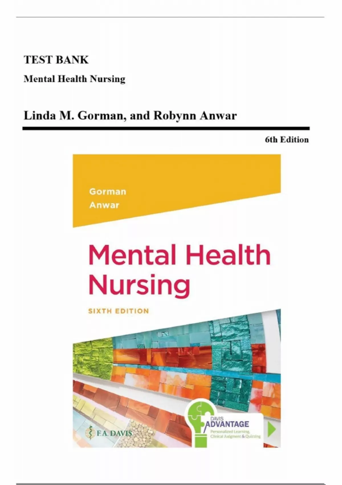 Test Bank for Mental Health Nursing Sixth Edition by Robynn Gorman. Fullhapters Include;...Table Of ContentI. Foundations for Mental Health Nursing 1. History of Mental Health Nursing 2. Basics of Communication 3. Ethics and Law 4. Developmental Psychology Throughout the Life Span 5. Sociocultural Influences on Mental Health 6. Nursing Process in Mental Health 7. Coping and Defense Mechanisms 8. Mental Health Treatments 9.Complementary and Alternative Treatment Modalities II. Threats to Mental Health 10. Anxiety, Anxiety-Related, and Somatic Symptom Disorders 11. Depressive Disorders 12. Bipolar Disorders 13. Suicide 14. Personality Disorders 15. Schizophrenia Spectrum and Other Psychotic Disorders 16. Neurocognitive Disorders: Delirium and Dementia 17. Substance Use and Addictive Disorders 18. Eating Disorders III. Special Populations 19. Childhood and Adolescent Mental Health Issues 20. Postpartum Issues in Mental Health 21. Aging Population 22. Victims of Abuse and Violence
