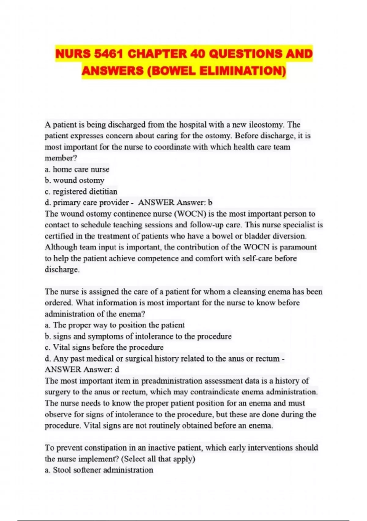 NURS 5461 CHAPTER 40 QUESTIONS AND ANSWERS (BOWEL ELIMINATION)