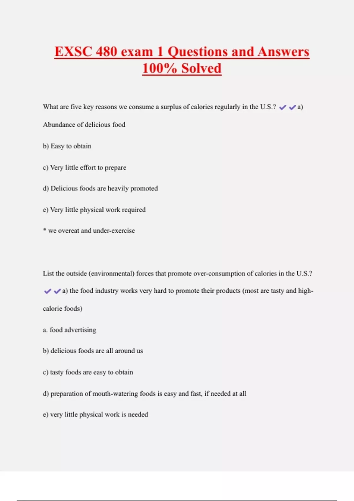 EXSC 480 exam 1 Questions and Answers 100% Solved What are five key reasons we consume a surplus of calories regularly in the U.S.? a) Abundance of delicious food b) Easy to obtain c) Very little effort to prepare d) Delicious foods are heavily promoted e) Very little physical work required * we overeat and under-exercise