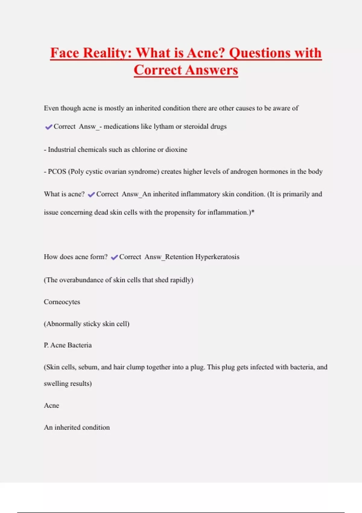 Face Reality: What is Acne? Questions with Correct Answers Even though acne is mostly an inherited condition there are other causes to be aware of Correct Answ_- medications like lytham or steroidal drugs - Industrial chemicals such as chlorine or dioxine - PCOS (Poly cystic ovarian syndrome) creates higher levels of androgen hormones in the body What is acne? Correct Answ_An inherited inflammatory skin condition. (It is primarily and issue concerning dead skin cells with the propensity for inflammation.)*