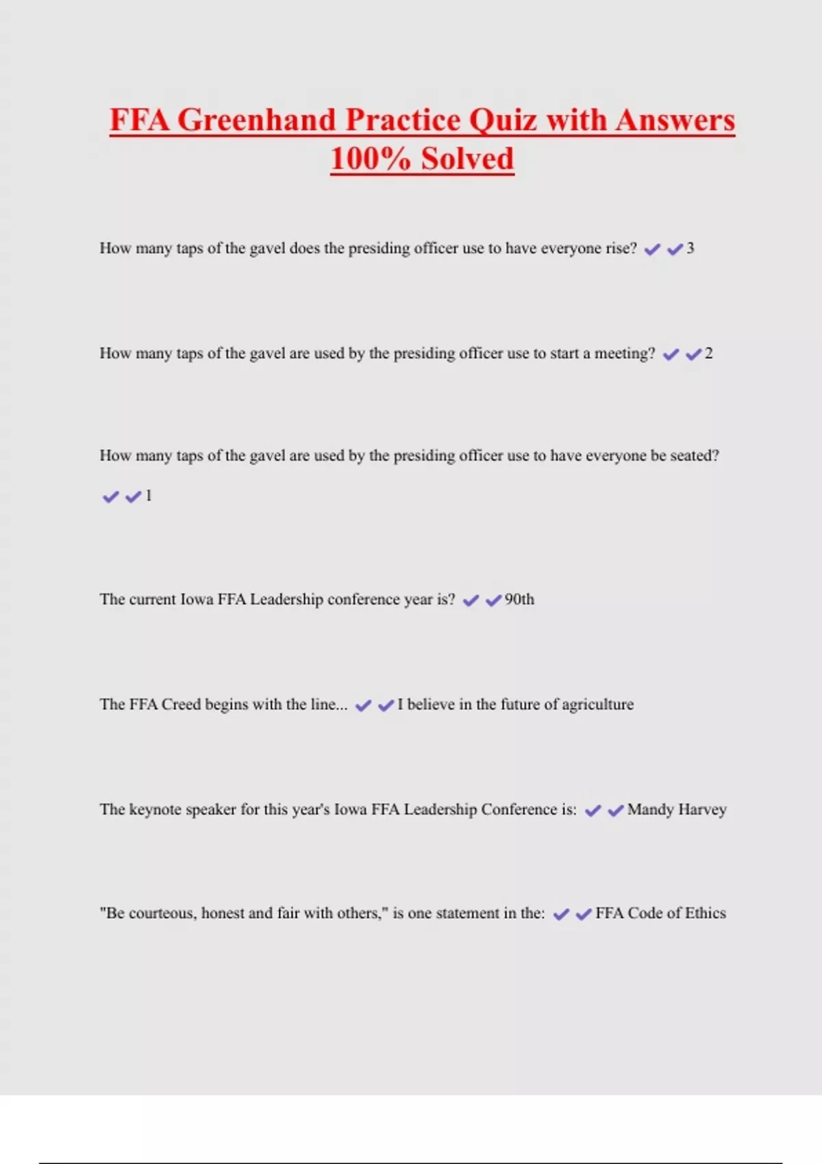 FFA Greenhand Practice Quiz with Answers 100% Solved How many taps of the gavel does the presiding officer use to have everyone rise? 3 How many taps of the gavel are used by the presiding officer use to start a meeting? 2 How many taps of the gavel are used by the presiding officer use to have everyone be seated? 1