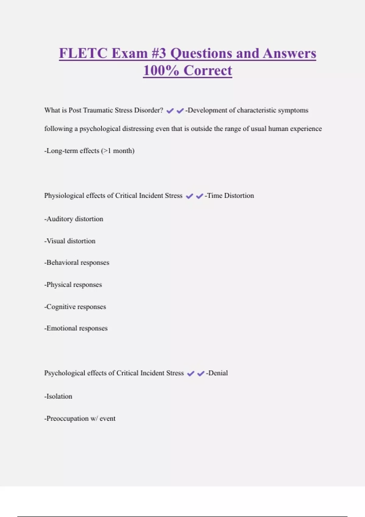 FLETC Exam #3 Questions and Answers 100% Correct What is Post Traumatic Stress Disorder? -Development of characteristic symptoms following a psychological distressing even that is outside the range of usual human experience -Long-term effects (>1 month) Physiological effects of Critical Incident Stress -Time Distortion -Auditory distortion -Visual distortion -Behavioral responses -Physical responses -Cognitive responses -Emotional responses