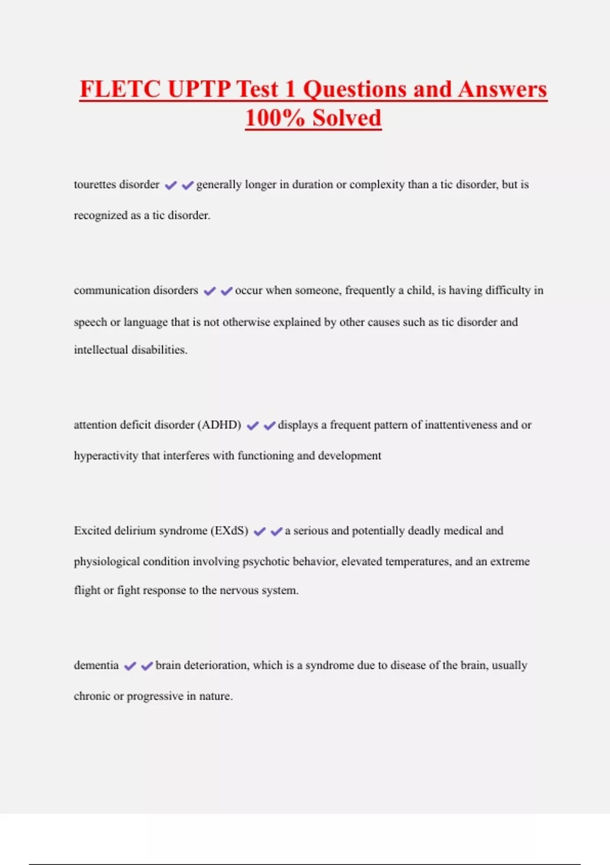 FLETC UPTP Test 1 Questions and Answers 100% Solved tourettes disorder generally longer in duration or complexity than a tic disorder, but is recognized as a tic disorder. communication disorders occur when someone, frequently a child, is having difficulty in speech or language that is not otherwise explained by other causes such as tic disorder and intellectual disabilities. attention deficit disorder (ADHD) displays a frequent pattern of inattentiveness and or hyperactivity that interferes with functioning and development