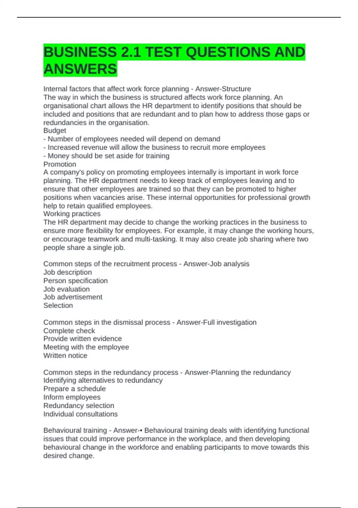 BUSINESS 2.1 TEST QUESTIONS AND ANSWERS