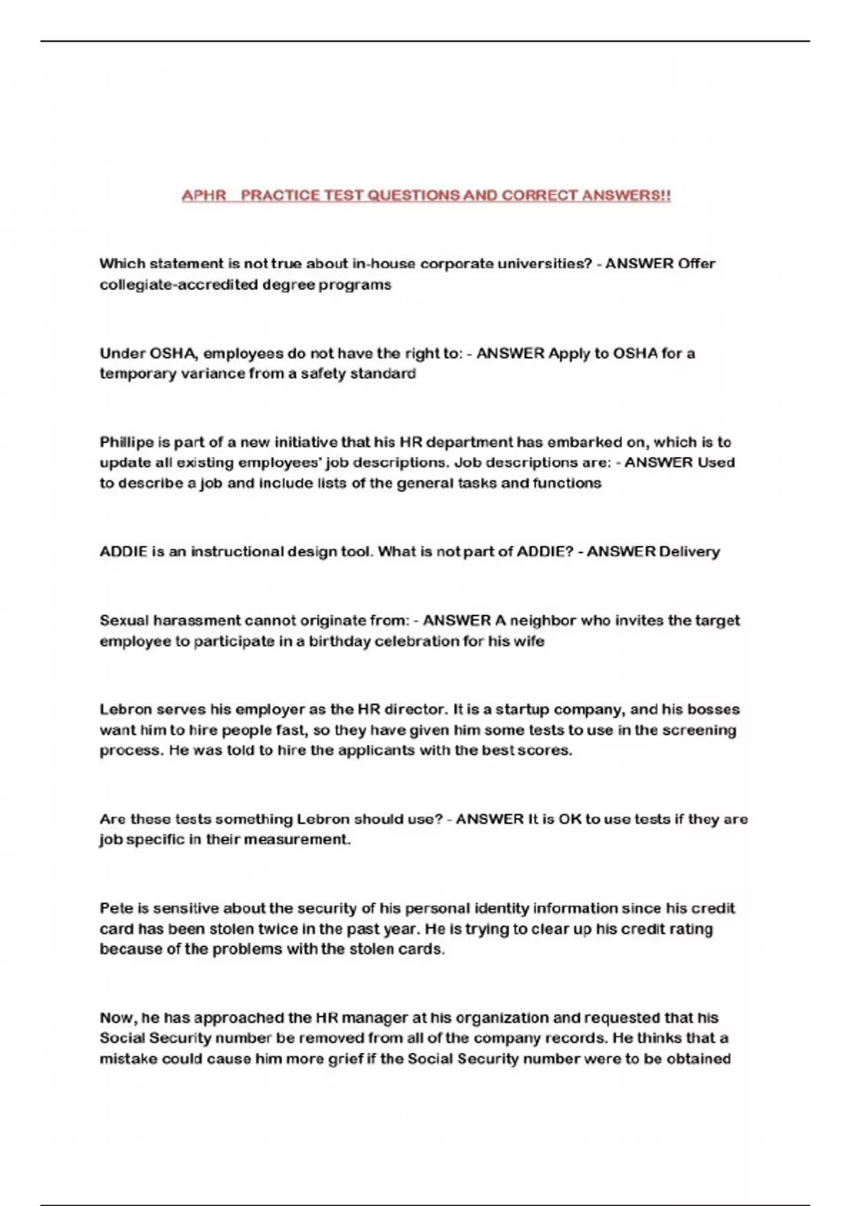 APHR PRACTICE TEST QUESTIONS AND CORRECT ANSWERS!!