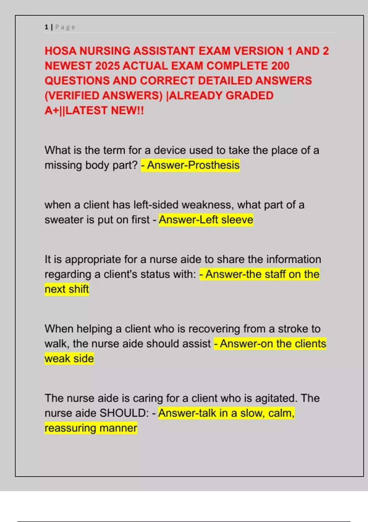 HOSA NURSING ASSISTANT EXAM VERSION 1 AND 2
