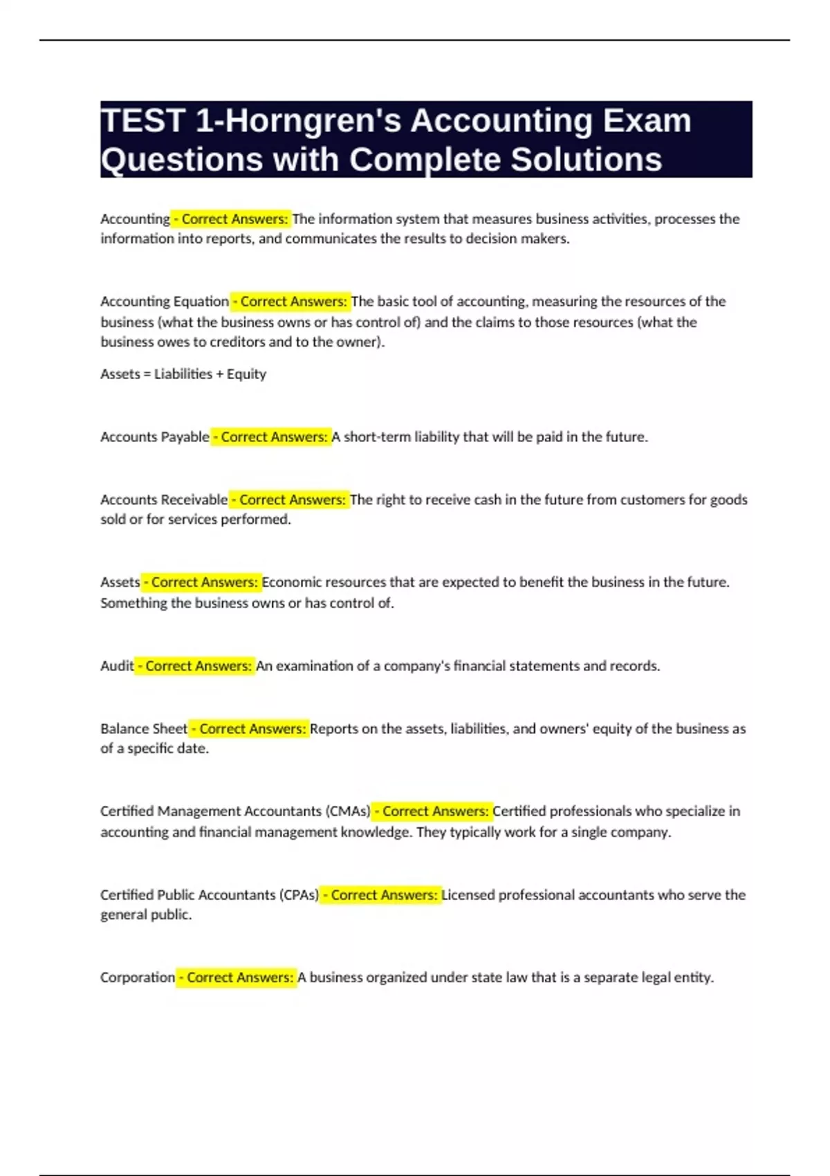 TEST 1-Horngren's Accounting Exam Questions with Complete Solutions Accounting - Correct Answers: The information system that measures business activities, processes the information into reports, and communicates the results to decision makers. Accounting Equation - Correct Answers: The basic tool of accounting, measuring the resources of the business (what the business owns or has control of) and the claims to those resources (what the business owes to creditors and to the owner). Assets = Liabilities + Equity Accounts Payable - Correct Answers: A short-term liability that will be paid in the future. Accounts Receivable - Correct Answers: The right to receive cash in the future from customers for goods sold or for services performed. Assets - Correct Answers: Economic resources that are expected to benefit the business in the future. Something the business owns or has control of. Audit - Correct Answers: An examination of a company's financial statements and records. Balance Sheet - Correct Answers: Reports on the assets, liabilities, and owners' equity of the business as of a specific date. Certified Management Accountants (CMAs) - Correct Answers: Certified professionals who specialize in accounting and financial management knowledge. They typically work for a single company. Certified Public Accountants (CPAs) - Correct Answers: Licensed professional accountants who serve the general public. Corporation - Correct Answers: A business organized under state law that is a separate legal entity. Cost Principle - Correct Answers: A principle that states that acquired assets and services should be recorded at their actual cost. Creditor - Correct Answers: Any person or business to whom a business owes money. Economic Entity Assumption - Correct Answers: An organization that stands apart as a separate economic unit. Equity - Correct Answers: The owners claim to the assets of the business. Expenses - Correct Answers: The costs of selling goods or services. Faithful Representation - Correct Answers: Providing information that is complete, neutral, and free from error. Financial Accounting - Correct Answers: The field of accounting that focuses on providing information for external decision makers. Financial Accounting Standards Board (FASB) - Correct Answers: The private organization that oversees the creation and governance of accounting standards in the United States. Financial Statements - Correct Answers: Business documents that are used to communicate information needed to make business decisions. Generally Accepted Accounting Principles (GAAP) - Correct Answers: Accounting guidelines, currently formulated by the Financial Accounting Standards Board (FASB); the main U.S. accounting rule book. Going Concern Assumption - Correct Answers: Assumes that the entity will remain in operation for the foreseeable future. Income Statement - Correct Answers: Reports the net income or net floss of the business for a specific period. International Accounting Standards Board (IASB) - Correct Answers: The private organization that oversees the creation and governance of International Financial Reporting Standards (IFRS) International Financial Reporting Standards (IFRS) - Correct Answers: A set of global accounting guidelines, formulated by the International Accounting Standards Board (IASB) Liabilities - Correct Answers: Debts that are owed to creditors. Limited-Liability Company (LLC) - Correct Answers: A company in which each member is only liable for his or her own actions. Managerial Accounting - Correct Answers: The field of accounting that focuses on providing information for internal decision makers. Monetary Unit Assumption - Correct Answers: The assumption that requires the items on the financial statements to be measured in terms of a monetary unit. Net Income - Correct Answers: The results of operations that occurs when total revenues are greater than total expenses. Net Loss - Correct Answers: The result of operations that occurs when total expenses are greater than total revenue. Owner's Capital - Correct Answers: Owners contributions to a business. Owner's Withdrawals - Correct Answers: Payments of equity to the owner. Partnership - Correct Answers: A business with two or more owners and not organized as a corporation. Return on Assets (ROA) - Correct Answers: Measures how profitably a company uses its assets. Net income/Average total assets Revenues - Correct Answers: Amounts earned from delivering goods or services to customers. Sarbanes-Oxley Act (SOX) - Correct Answers: Requires management to review internal control and take responsibility for the accuracy and completeness of their financial reports. Securities and Exchange Commission (SEC) - Correct Answers: U.S. governmental agency that oversees the U.S. financial markets. Sole Proprietorship - Correct Answers: A business with a single owner. Statement of Cash Flows - Correct Answers: Reports on a businesses cash receipts and cash payments for a specific period. Statement of Owner's Equity - Correct Answers: Shows the changes in the owner's capital account for a specific period. Transaction - Correct Answers: An event that affects the financial position of the business and can be measured with faithful representation. Account - Correct Answers: A detailed record of all increases and decrease that have occurred in an individual asset, liability, or equity during a specific period. Accrued Liability - Correct Answers: A liability for which the business knows the amount owed but the bill has not been paid. Chart of Accounts - Correct Answers: A list of all of a company's accounts with their account numbers. Compound Journal Entry - Correct Answers: A journal entry that is characterized by having multiple debits and/or multiple credits. Credit - Correct Answers: The right side of a T-Account. Debit - Correct Answers: The left side of a T-Account. Debt Ratio - Correct Answers: Shows the proportion of assets financed with debt Total liabil
