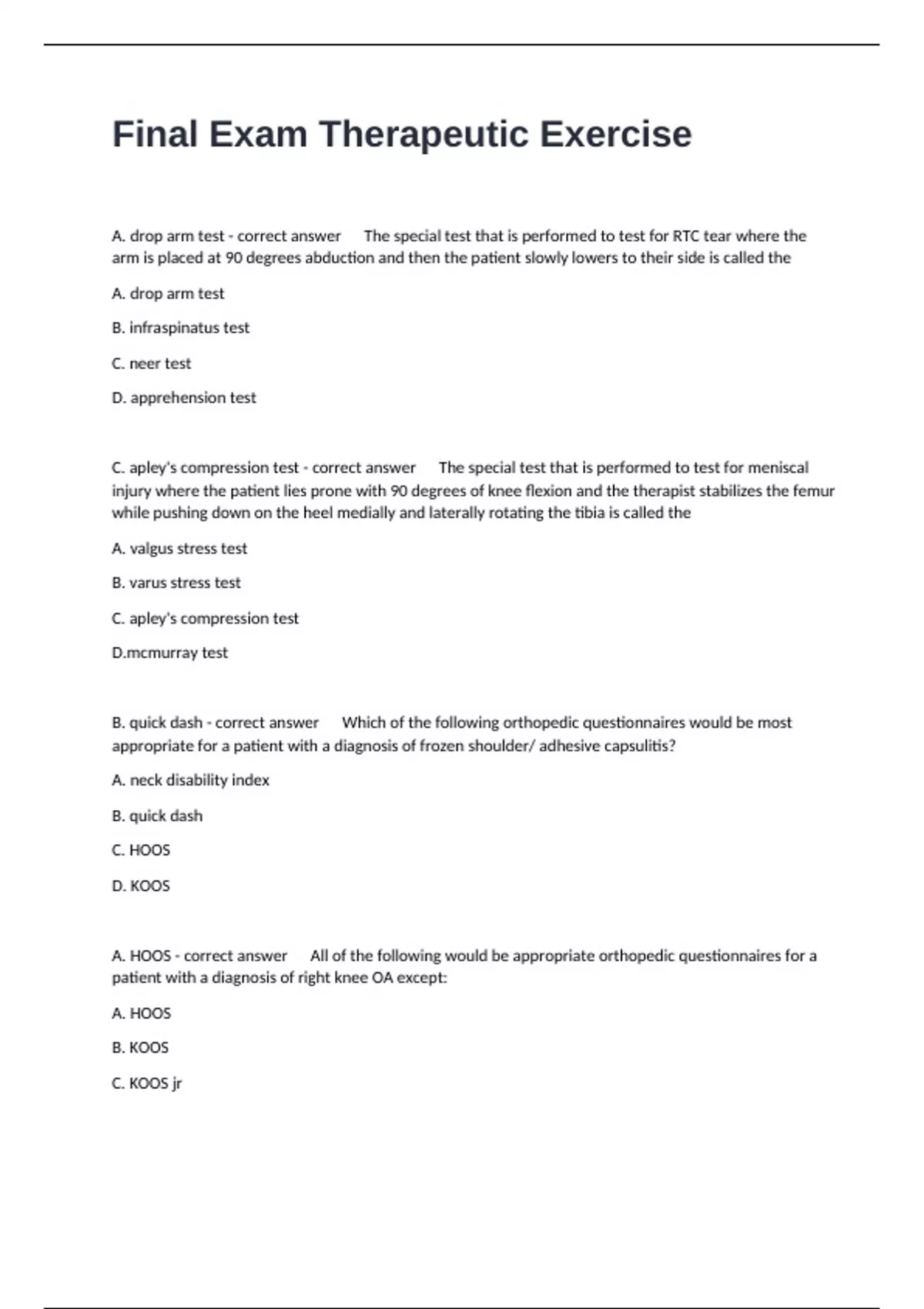 B. quick dash - correct answer Which of the following orthopedic questionnaires would be most