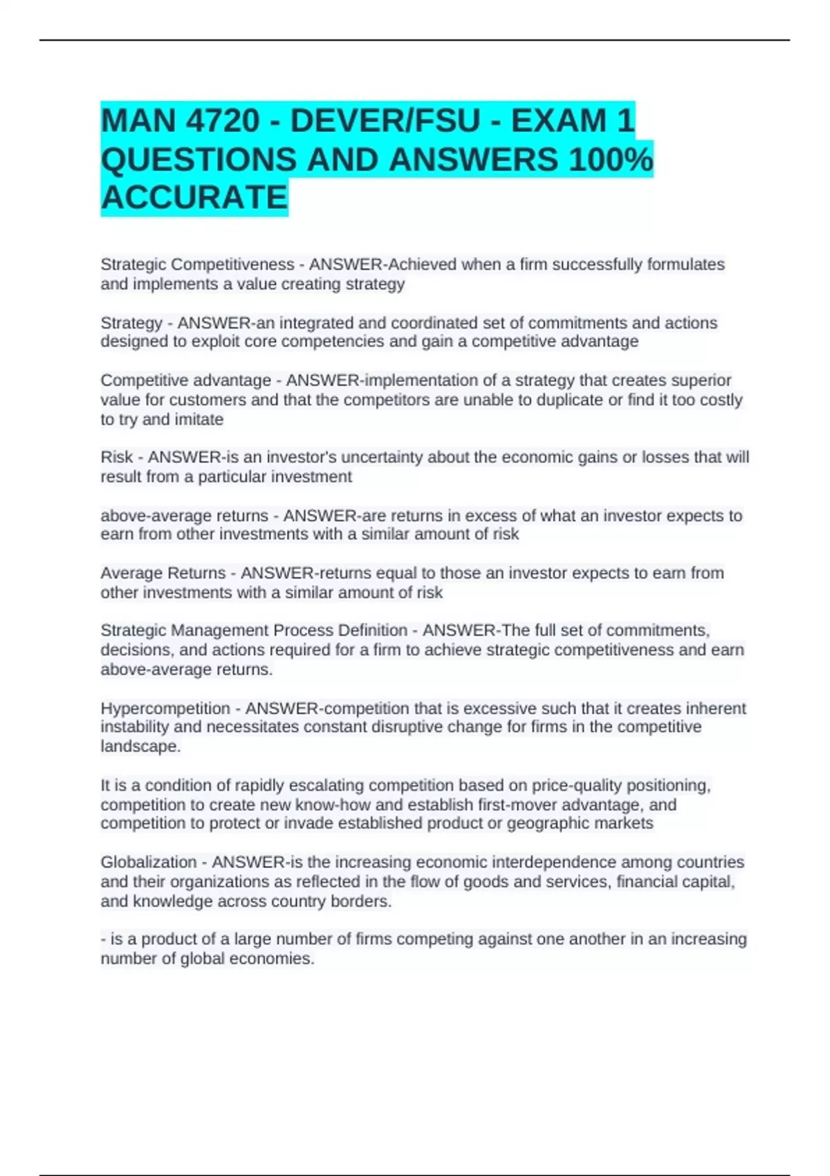 Strategic Competitiveness - ANSWER-Achieved when a firm successfully formulates and implements a value creating strategy Strategy - ANSWER-an integrated and coordinated set of commitments and actions designed to exploit core competencies and gain a competitive advantage Competitive advantage - ANSWER-implementation of a strategy that creates superior value for customers and that the competitors are unable to duplicate or find it too costly to try and imitate Risk - ANSWER-is an investor's uncertainty about the economic gains or losses that will result from a particular investment above-average returns - ANSWER-are returns in excess of what an investor expects to earn from other investments with a similar amount of risk