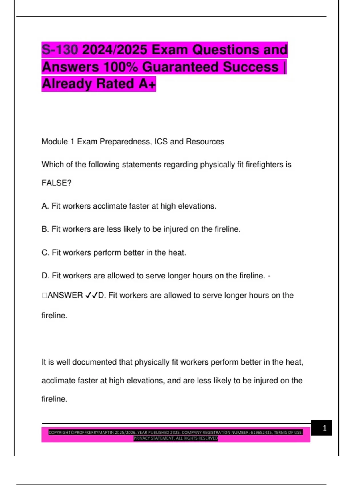 S-130 2024/2025 Exam Questions and Answers 100% Guaranteed Success | Already Rated A+ Module 1 Exam Preparedness, ICS and Resources Which of the following statements regarding physically fit firefighters is FALSE? A. Fit workers acclimate faster at high elevations. B. Fit workers are less likely to be injured on the fireline. C. Fit workers perform better in the heat. D. Fit workers are allowed to serve longer hours on the fireline. - � �ANSWER D. Fit workers are allowed to serve longer hours on the fireline. It is well documented that physically fit workers perform better in the heat, acclimate faster at high elevations, and are less likely to be injured on the fireline.