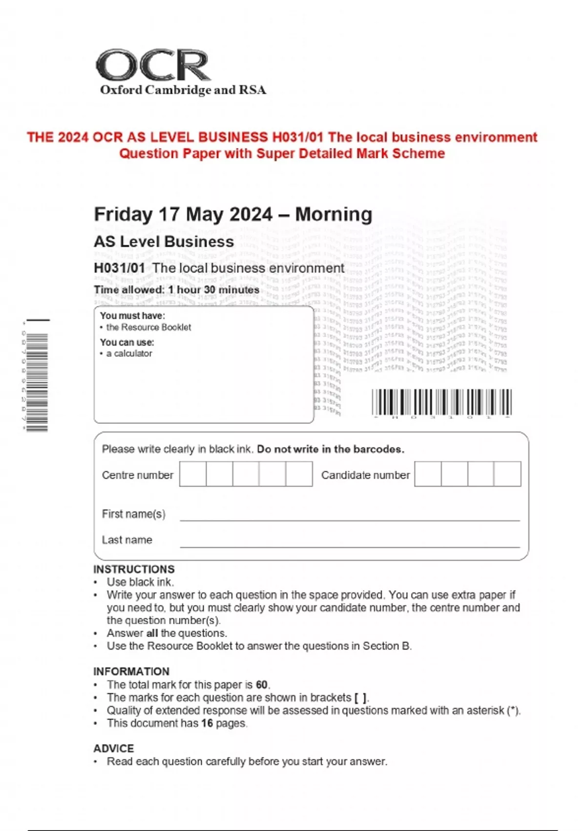 THE 2024 OCR AS LEVEL BUSINESS H031/01 The local business environment Question Paper with Super Detailed Mark Scheme