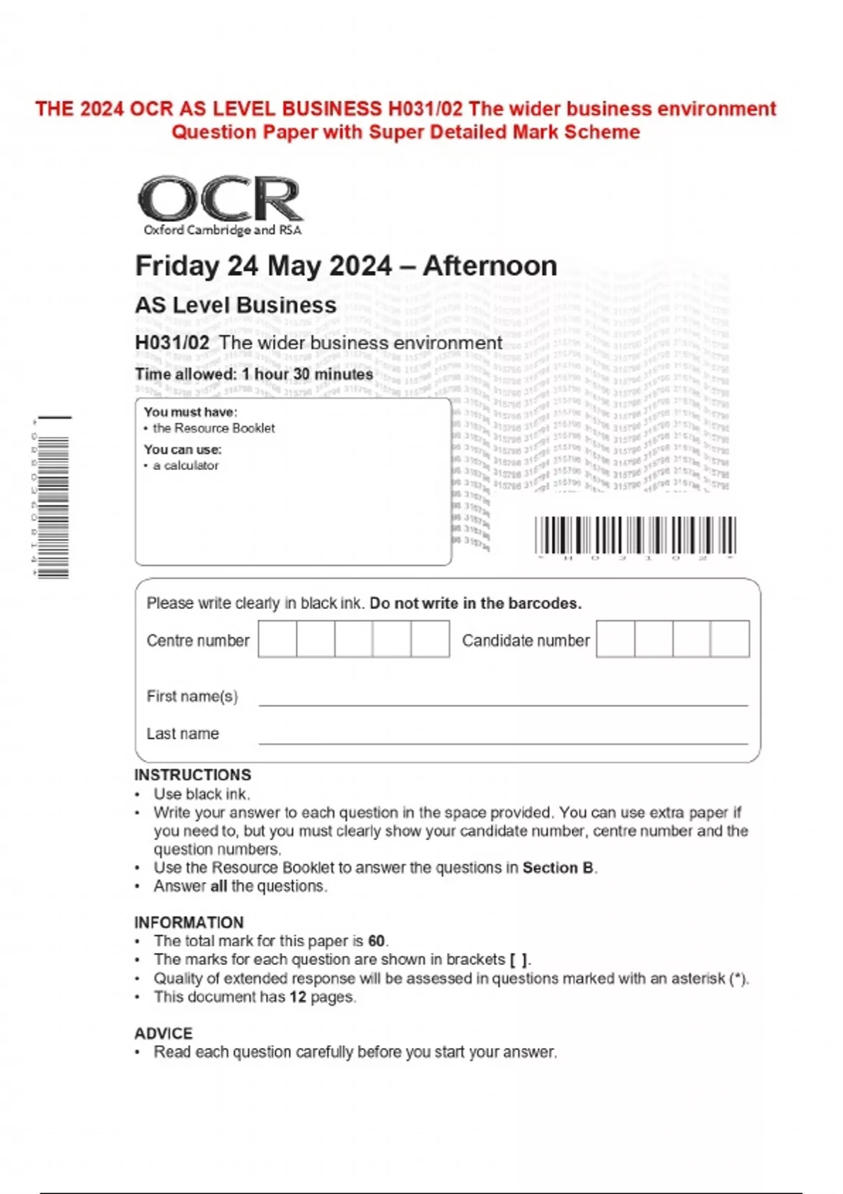 THE 2024 OCR AS LEVEL BUSINESS H031/02 The wider business environment Question Paper with Super Detailed Mark Scheme