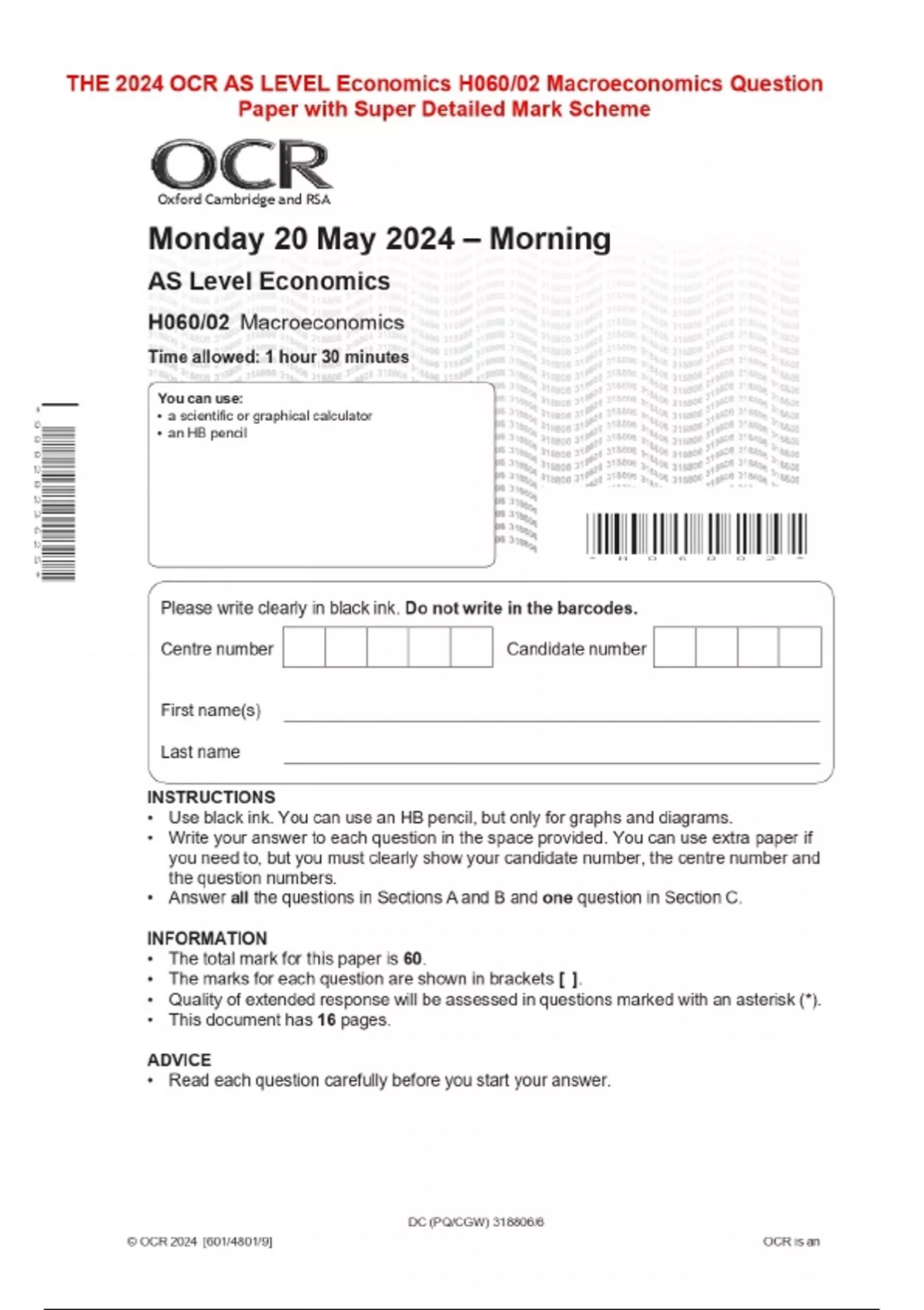 THE 2024 OCR AS LEVEL Economics H060/02 Macroeconomics Question Paper with Super Detailed Mark Scheme