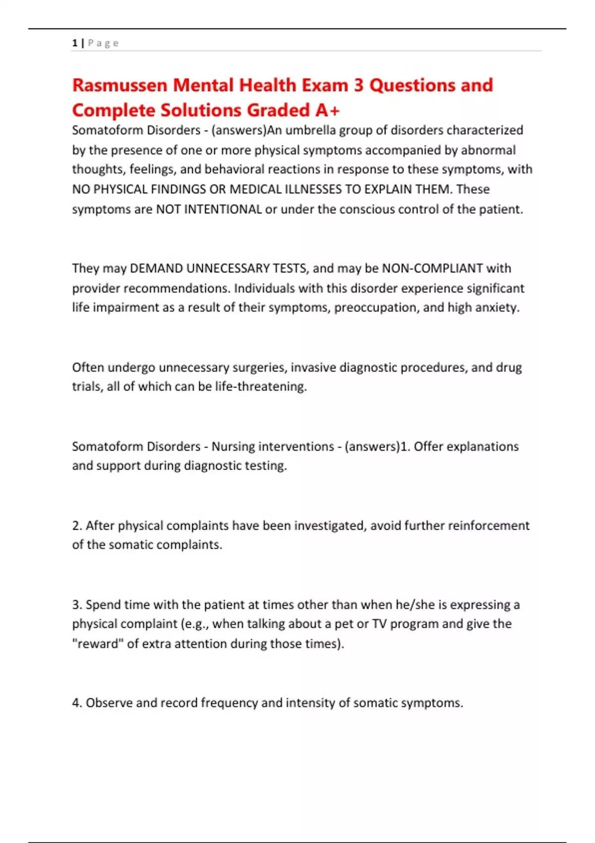 Somatoform Disorders - Nursing interventions - (answers)1. Offer explanations