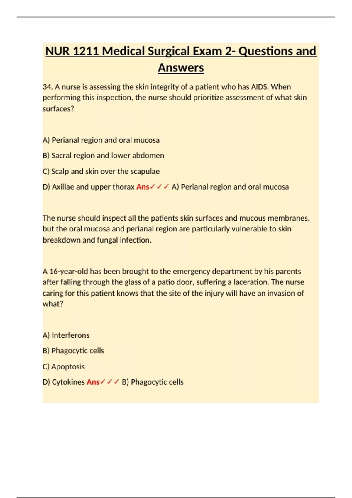 34. A nurse is assessing the skin integrity of a patient who has AIDS. When performing this inspection, the nurse should prioritize assessment of what skin surfaces? A) Perianal region and oral mucosa B) Sacral region and lower abdomen C) Scalp and skin over the scapulae D) Axillae and upper thorax Ans A) Perianal region and oral mucosa The nurse should inspect all the patients skin surfaces and mucous membranes, but the oral mucosa and perianal region are particularly vulnerable to skin breakdown and fungal infection. A 16-year-old has been brought to the emergency department by his parents after falling through the glass of a patio door, suffering a laceration. The nurse caring for this patient knows that the site of the injury will have an invasion of what? A) Interferons B) Phagocytic cells