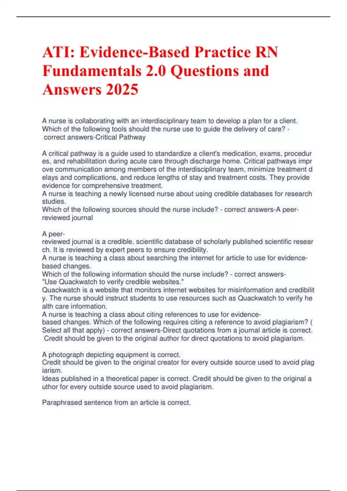 ATI: Evidence-Based Practice RN Fundamentals 2.0 Questions and Answers 2025