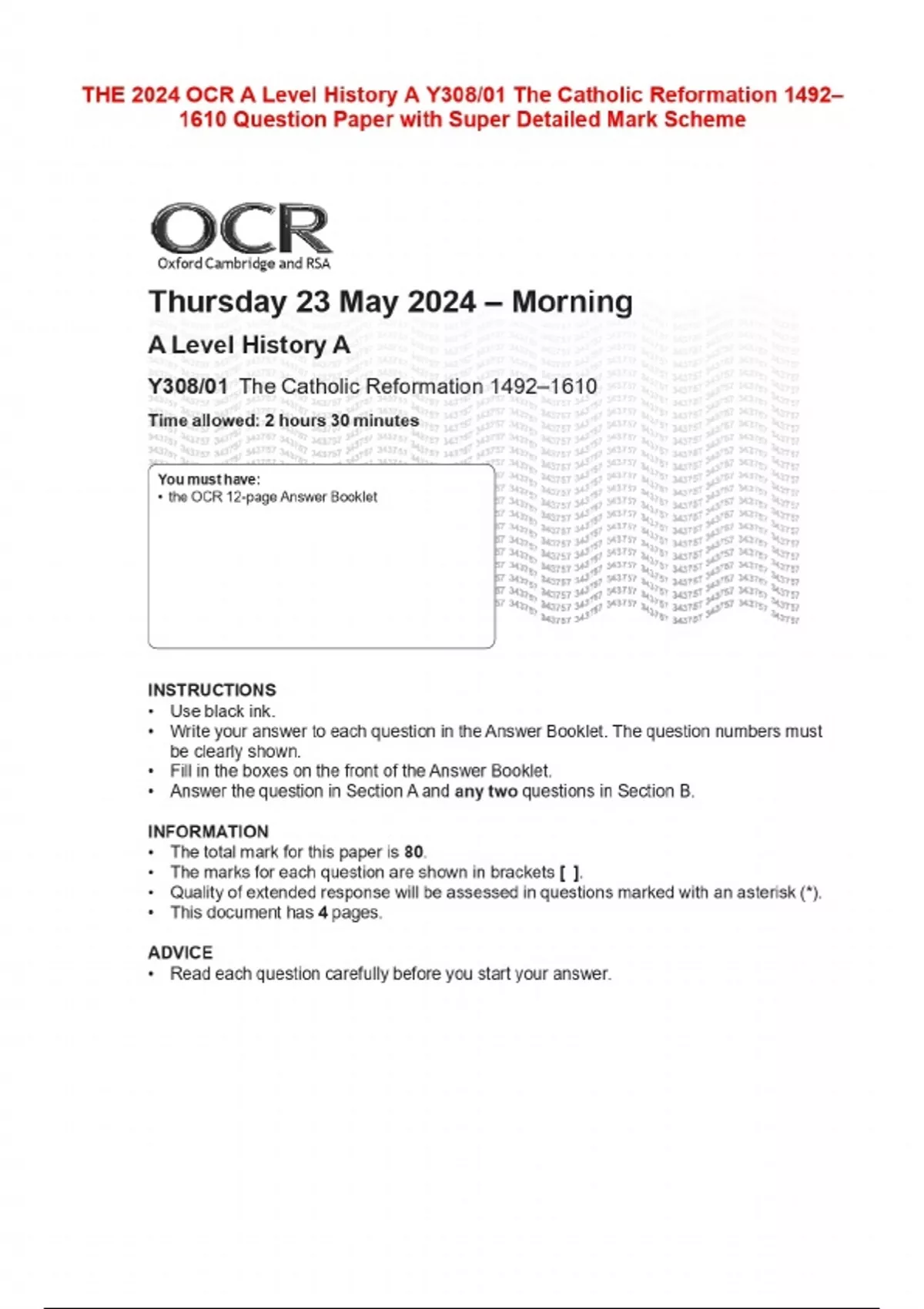 THE 2024 OCR A Level History A Y308/01 The Catholic Reformation 1492– 1610 Question Paper with Super Detailed Mark Scheme