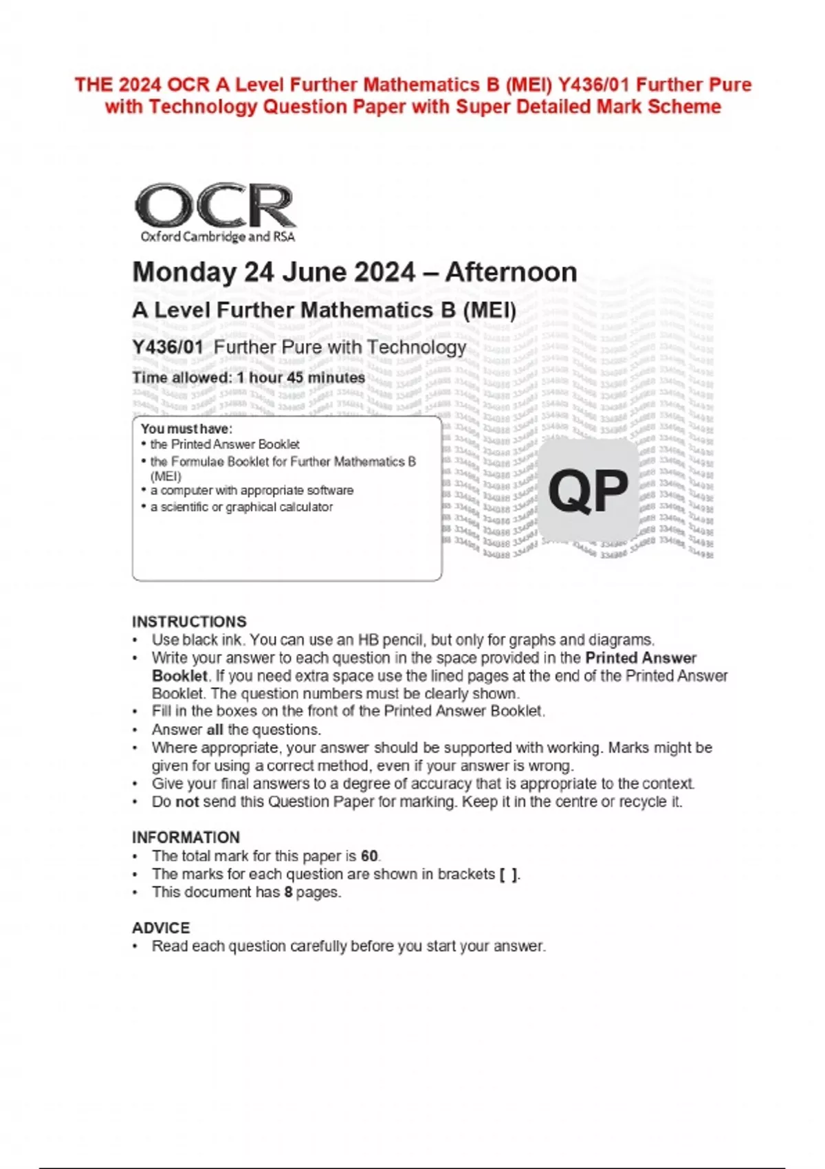 THE 2024 OCR A Level Further Mathematics B (MEI) Y436/01 Further Pure with Technology Question Paper with Super Detailed Mark Scheme