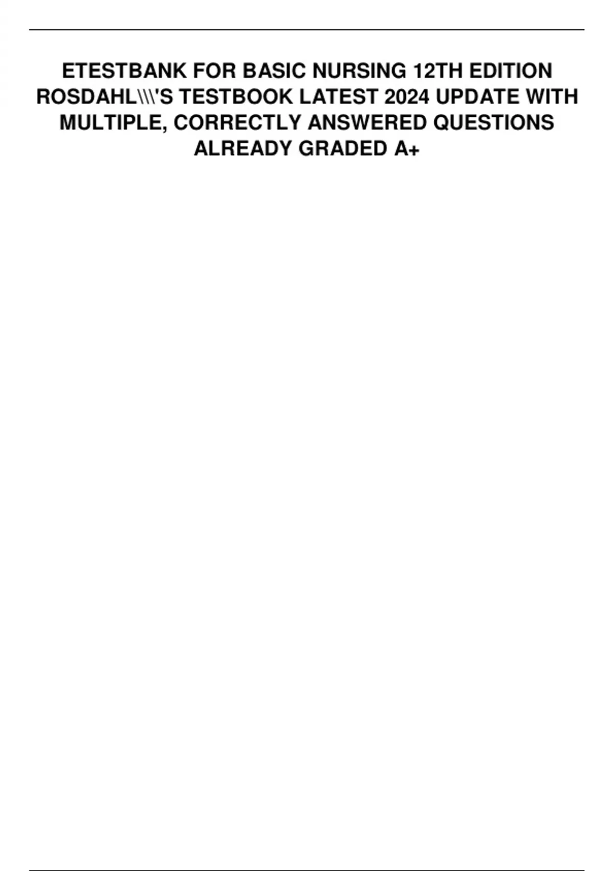 TESTBANK FOR BASIC NURSING 12TH EDITION ROSDAHL'S TESTBOOK LATEST 2024 UPDATE WITH MULTIPLE, CORRECTLY ANSWERED QUESTIONS ALREADY GRADED A+