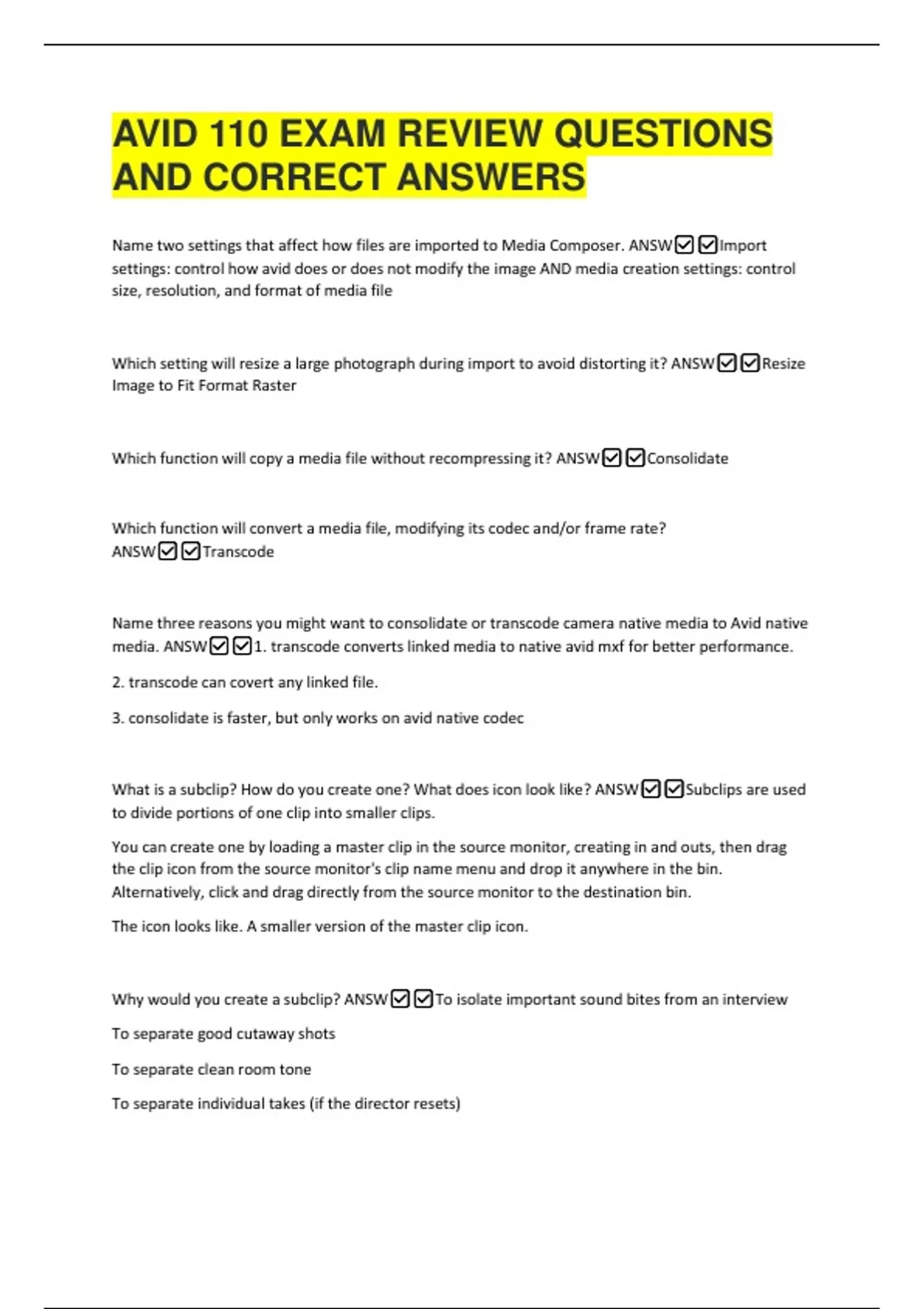 AVID 110 EXAM REVIEW QUESTIONS AND CORRECT ANSWERS Name two settings that affect how files are imported to Media Composer. ANSWImport settings: control how avid does or does not modify the image AND media creation settings: control size, resolution, and format of media file Which setting will resize a large photograph during import to avoid distorting it? ANSWResize Image to Fit Format Raster Which function will copy a media file without recompressing it? ANSWConsolidate Which function will convert a media file, modifying its codec and/or frame rate? ANSWTranscode
