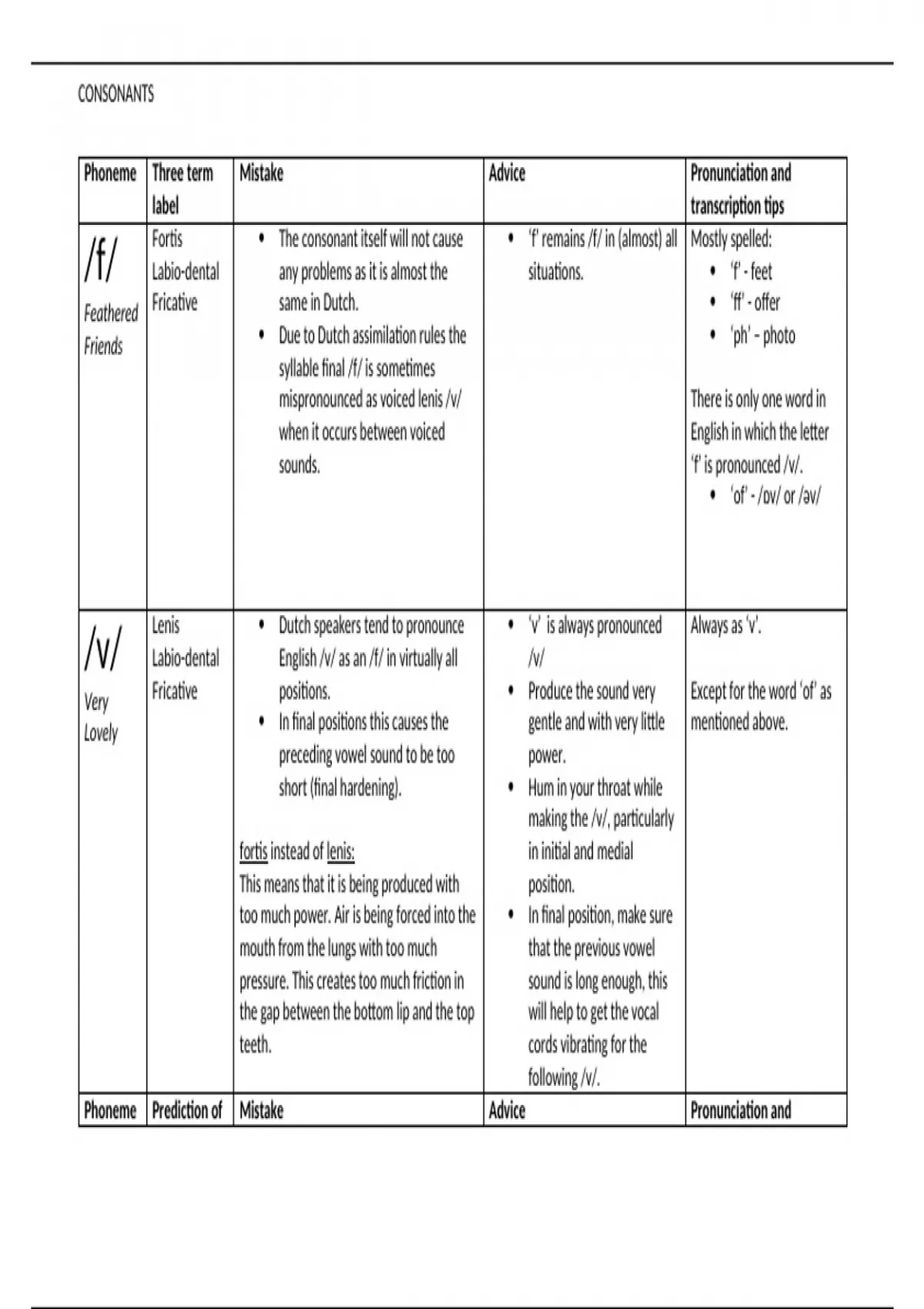 DUTCH: In deze drie documenten staat per phonetic symbol een overzicht van: - Phoneme - Prediction of mistake - Mistake in technical terms - Advice - Pronunciation and transcription tips Te gebruiken voor Phonetics, P&P en Transcription ENGLISH: These three documents provide an overview per phonetic symbol of: - Phoneme - Prediction of errors - Error in technical terms - Advice - Pronunciation and transcription tips To be used for phonetics, P&P and transcription