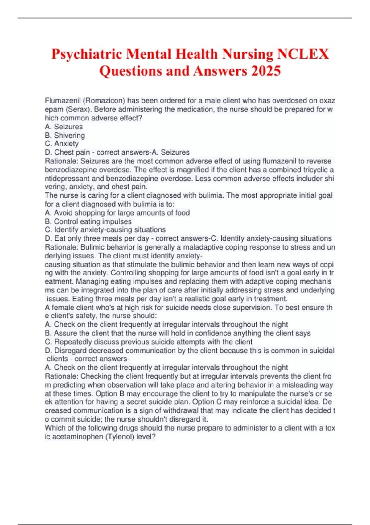 Psychiatric Mental Health Nursing NCLEX Questions and Answers 2025