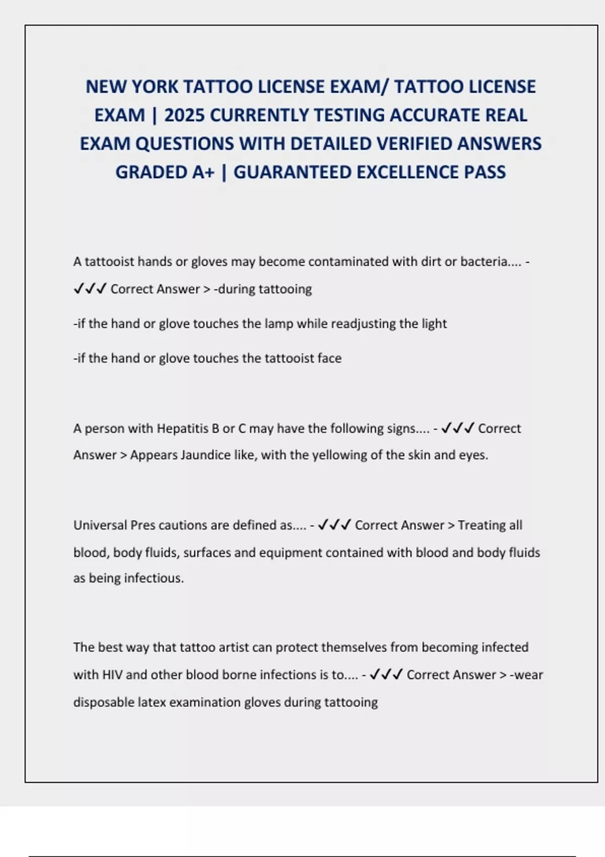 NEW YORK TATTOO LICENSE EXAM/ TATTOO LICENSE EXAM | 2025 CURRENTLY TESTING ACCURATE REAL EXAM QUESTIONS WITH DETAILED VERIFIED ANSWERS GRADED A+ | GUARANTEED EXCELLENCE PASS