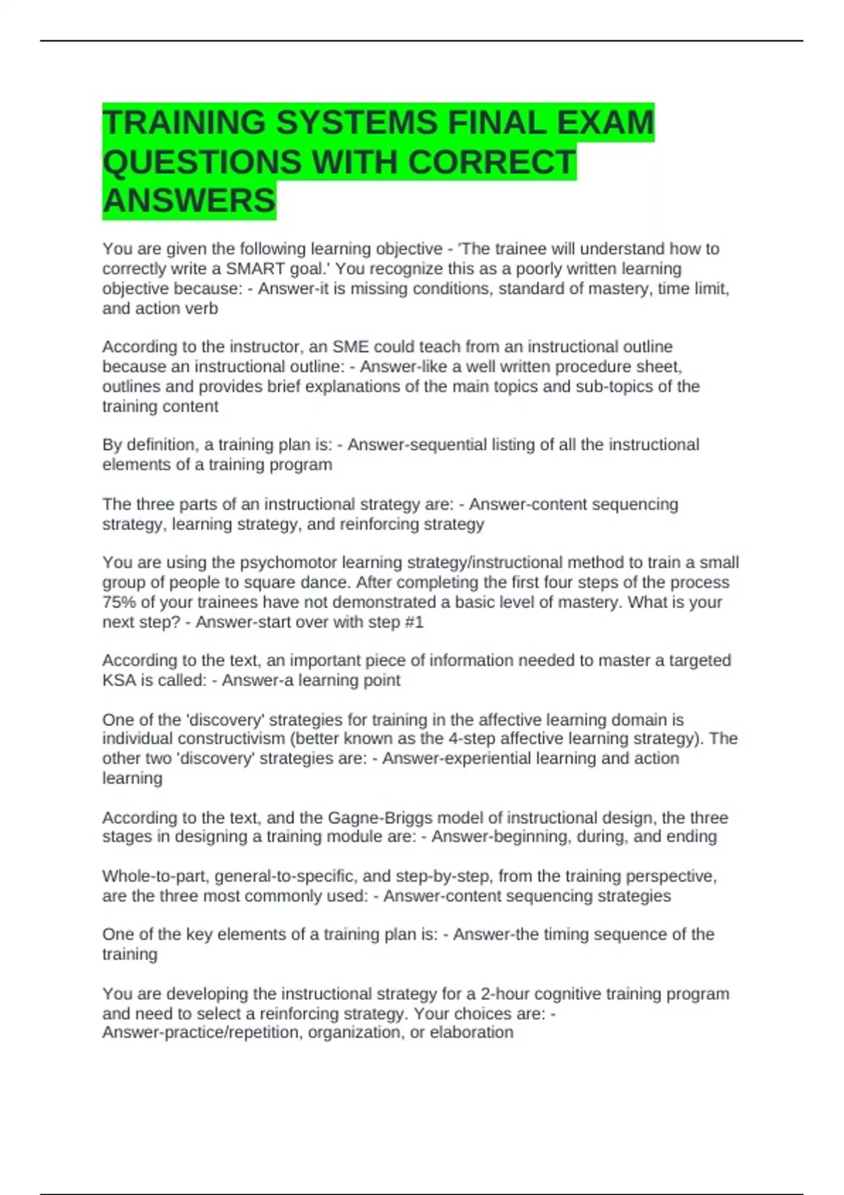 TRAINING SYSTEMS FINAL EXAM QUESTIONS WITH CORRECT ANSWERS