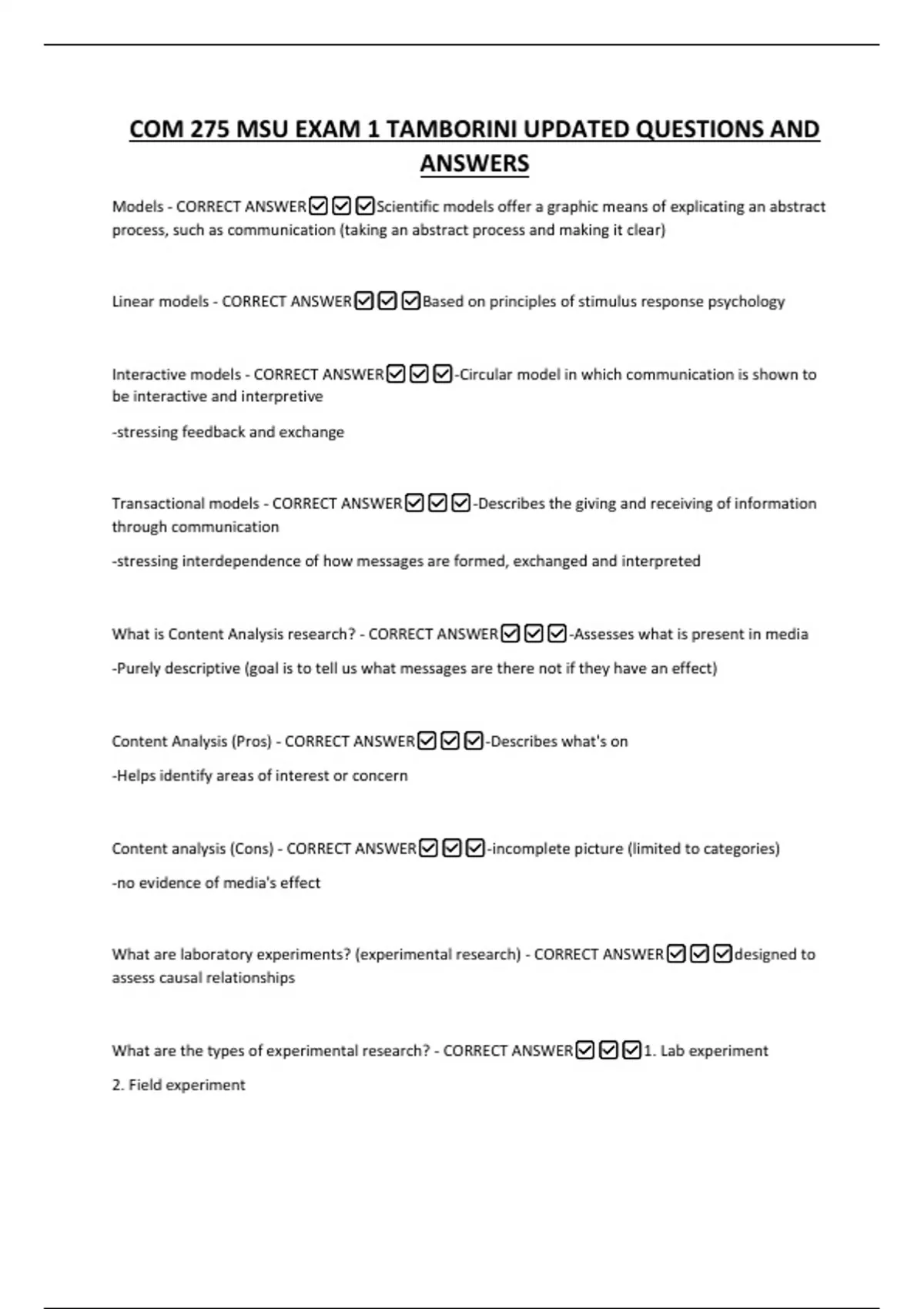 COM 275 MSU EXAM 1 TAMBORINI UPDATED QUESTIONS AND ANSWERS Models - CORRECT ANSWERScientific models offer a graphic means of explicating an abstract process, such as communication (taking an abstract process and making it clear)