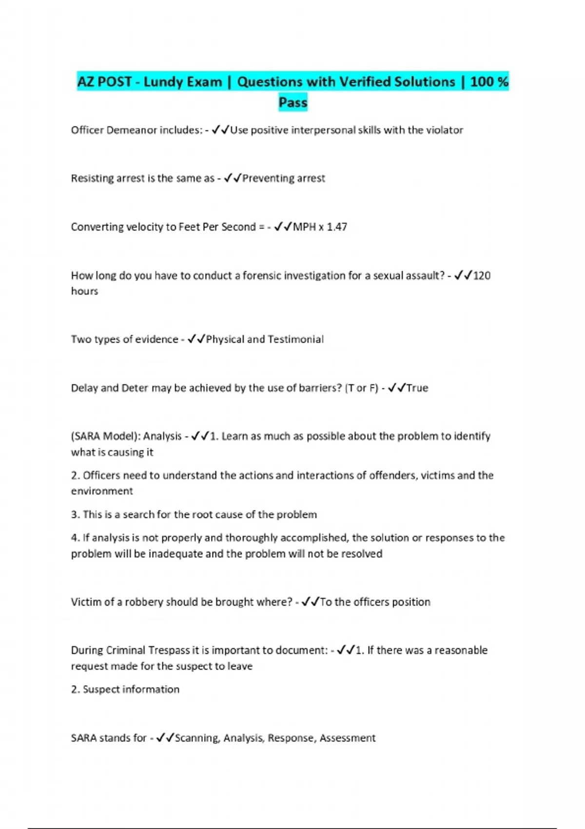 AZ POST - Lundy Exam | Questions with Verified Solutions | 100 % Pass