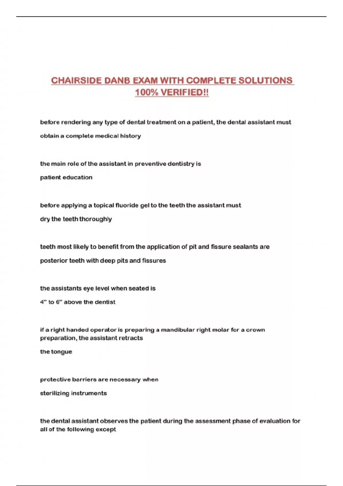 CHAIRSIDE DANB EXAM WITH COMPLETE SOLUTIONS 100% VERIFIED!!...