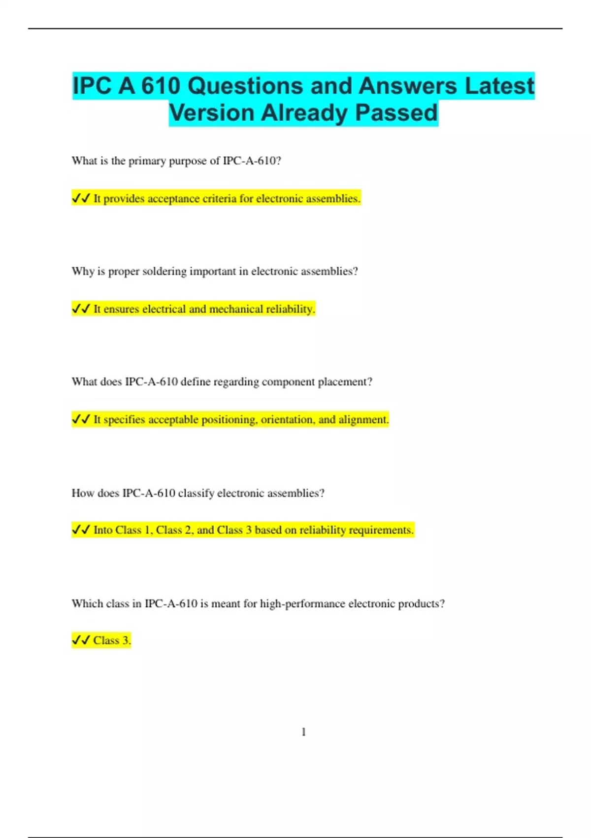 IPC A 610 Questions and Answers Latest Version Already Passed What is the primary purpose of IPC-A-610? It provides acceptance criteria for electronic assemblies. Why is proper soldering important in electronic assemblies? It ensures electrical and mechanical reliability. What does IPC-A-610 define regarding component placement? It specifies acceptable positioning, orientation, and alignment. How does IPC-A-610 classify electronic assemblies? Into Class 1, Class 2, and Class 3 based on reliability requirements. Which class in IPC-A-610 is meant for high-performance electronic products? Class 3. 2 What is considered an acceptable solder joint under IPC-A-610? A smooth, well-formed, and properly wetted connection. Why is proper lead trimming necessary in assembly? To prevent short circuits and mechanical stress. What type of defects does IPC-A-610 address in soldering? Cold solder joints, insufficient solder, and solder bridging. Why is proper component orientation crucial? To ensure correct functionality and avoid polarity errors. What is a common issue when soldering surface mount components? Tombstoning, where one end lifts from the pad. How does IPC-A-610 define acceptable solder fillets for through-hole components? They must exhibit complete wetting and proper fillet height. 3 What is the main concern with insufficient solder on a joint? It may lead to poor electrical contact and weak mechanical strength. Why is cleanliness important in electronic assemblies? Contaminants can cause corrosion, short circuits, and reliability issues. What does IPC-A-610 say about foreign materials on a PCB? They must be removed to prevent defects and failures. Why is proper handling of electronic assemblies critical? To prevent electrostatic discharge (ESD) damage and physical defects. What is the risk of excessive solder application? It can cause bridging between leads, leading to short circuits. Why must PCB assemblies be inspected after soldering? To ensure compliance with IPC-A-610 quality standards. 4 What is the required solder fillet height for a through-hole joint in Class 3? It must be at least as high as the lead shoulder.