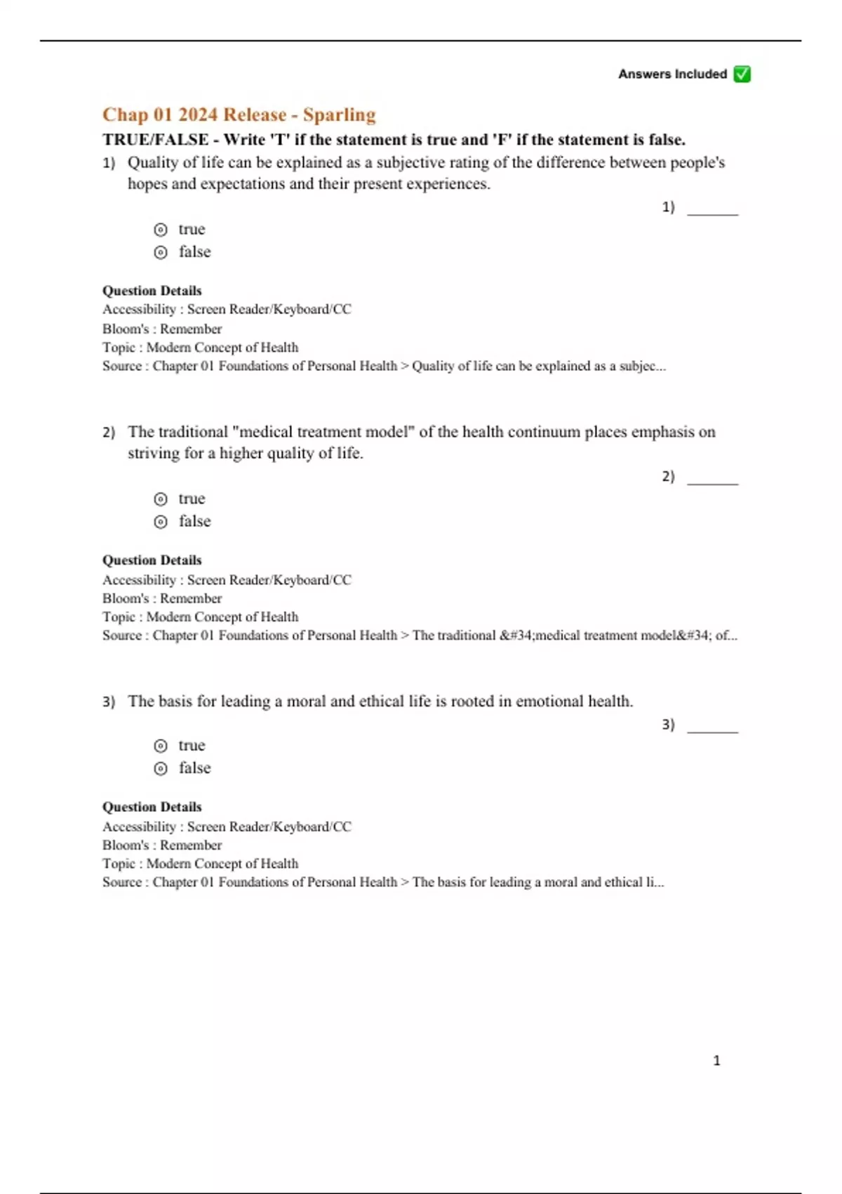 Source : Chapter 01 Foundations of Personal Health > Quality of life can be explained as a subjec...