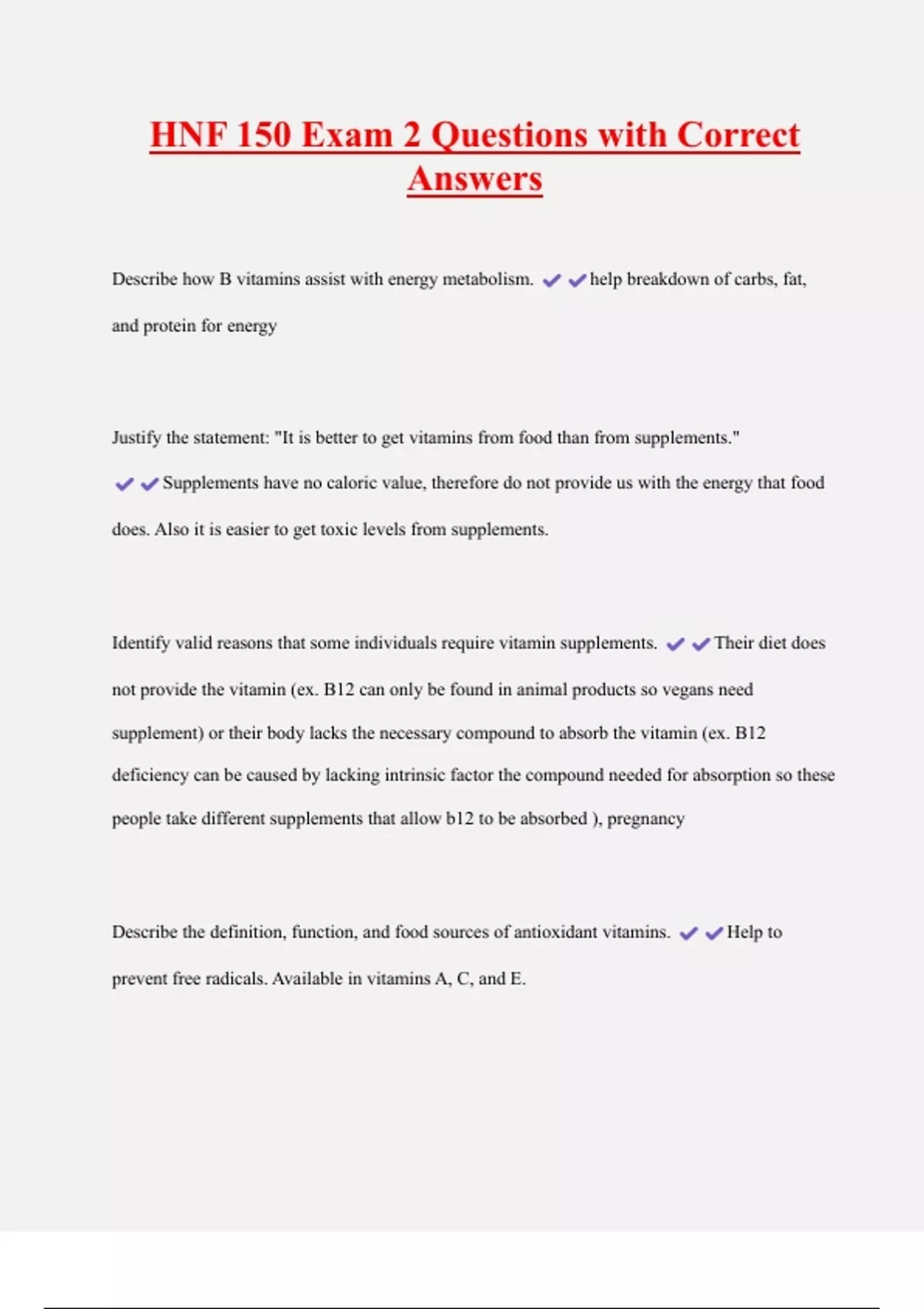 HNF 150 Exam 2 Questions with Correct Answers Describe how B vitamins assist with energy metabolism. help breakdown of carbs, fat, and protein for energy Justify the statement: "It is better to get vitamins from food than from supplements." Supplements have no caloric value, therefore do not provide us with the energy that food does. Also it is easier to get toxic levels from supplements.