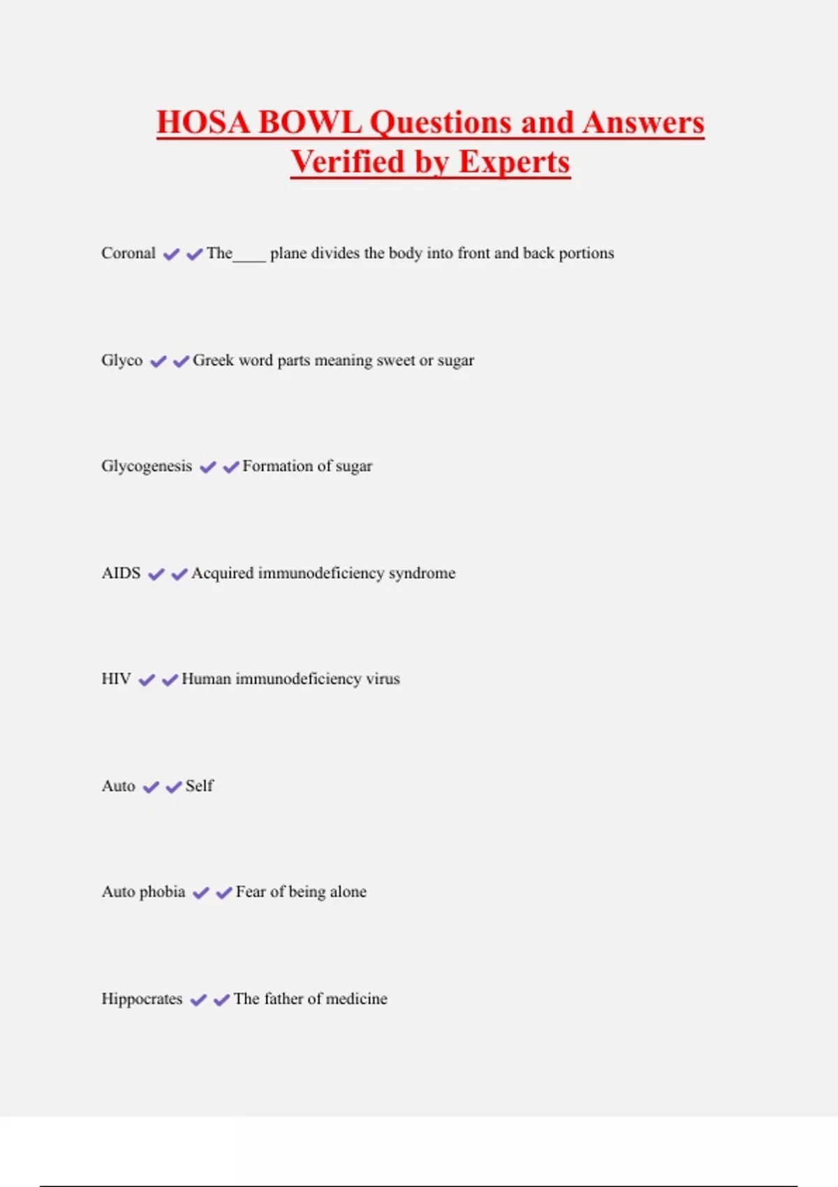HOSA BOWL Questions and Answers Verified by Experts Coronal The____ plane divides the body into front and back portions Glyco Greek word parts meaning sweet or sugar Glycogenesis Formation of sugar AIDS Acquired immunodeficiency syndrome
