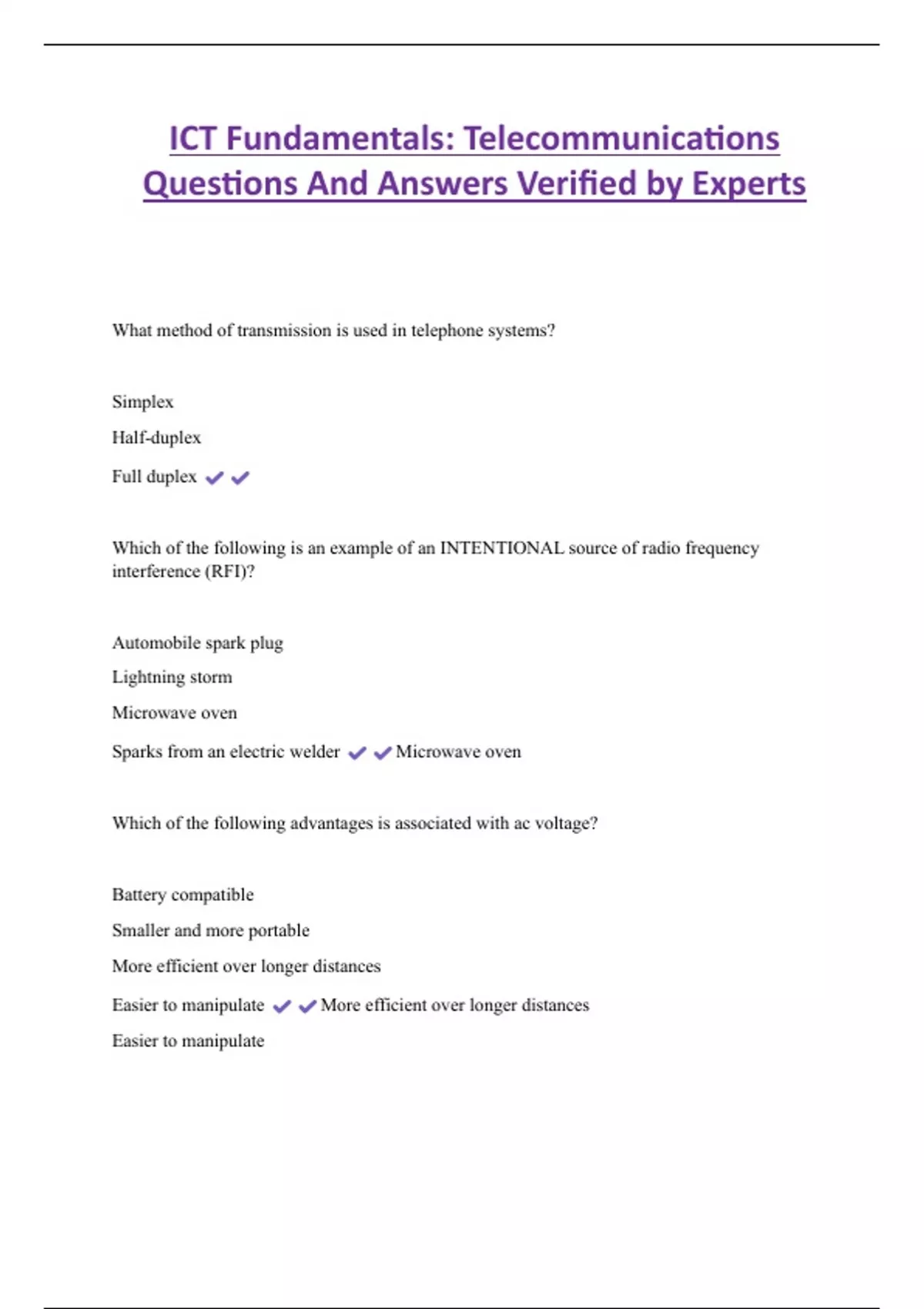ICT Fundamentals: Telecommunications Questions And Answers Verified by Experts What method of transmission is used in telephone systems? Simplex Half-duplex Full duplex Which of the following is an example of an INTENTIONAL source of radio frequency interference (RFI)? Automobile spark plug Lightning storm Microwave oven Sparks from an electric welder Microwave oven