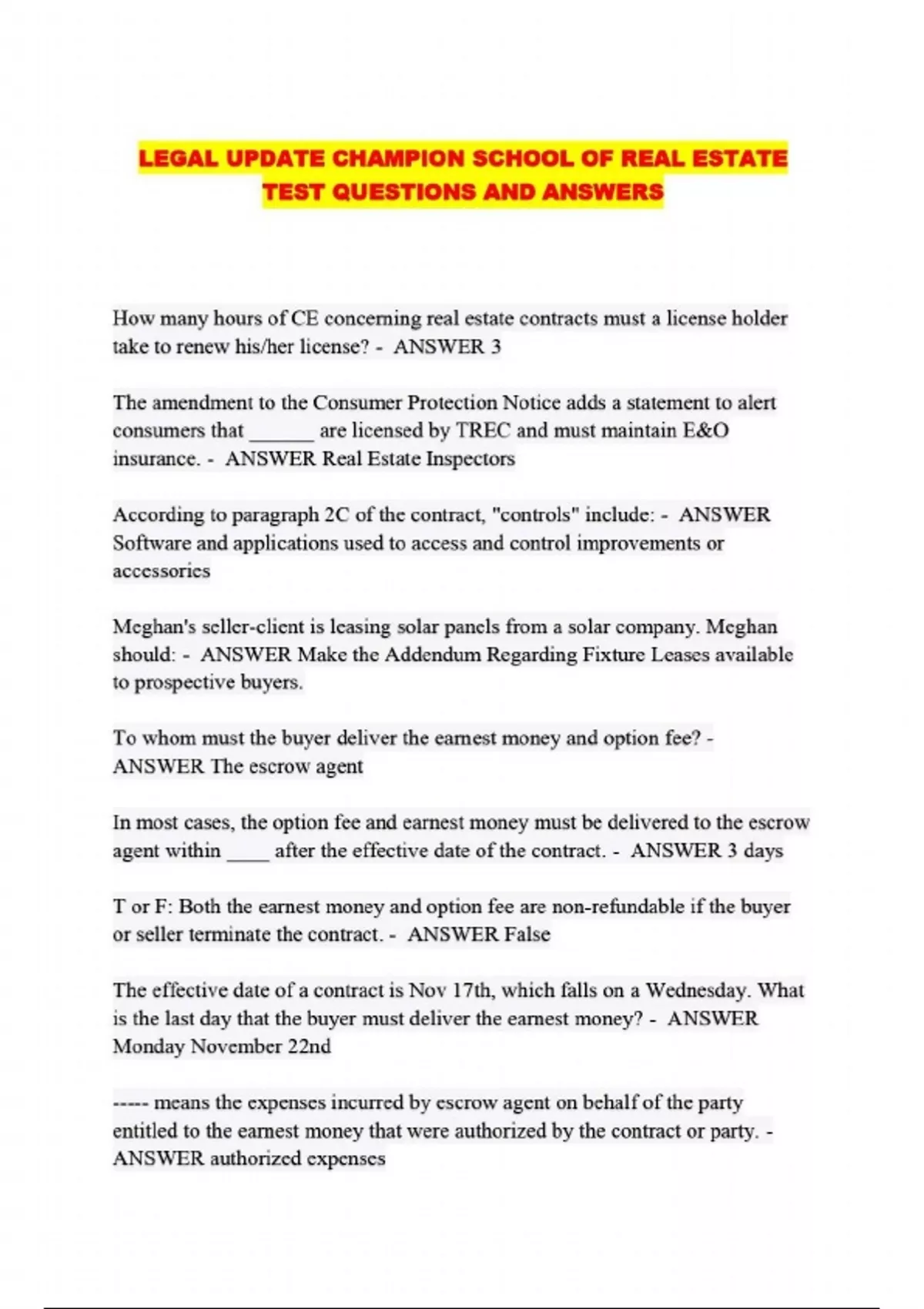 LEGAL UPDATE CHAMPION SCHOOL OF REAL ESTATE TEST QUESTIONS AND ANSWERS...