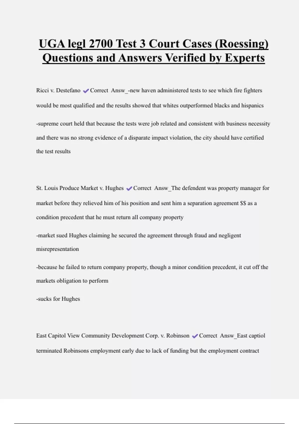 UGA legl 2700 Test 3 Court Cases (Roessing) Questions and Answers Verified by Experts Ricci v. Destefano Correct Answ_-new haven administered tests to see which fire fighters would be most qualified and the results showed that whites outperformed blacks and hispanics -supreme court held that because the tests were job related and consistent with business necessity and there was no strong evidence of a disparate impact violation, the city should have certified the test results St. Louis Produce Market v. Hughes Correct Answ_The defendent was property manager for market before they relieved him of his position and sent him a separation agreement $$ as a condition precedent that he must return all company property -market sued Hughes claiming he secured the agreement through fraud and negligent misrepresentation -because he failed to return company property, though a minor condition precedent, it cut off the markets obligation to perform -sucks for Hughes