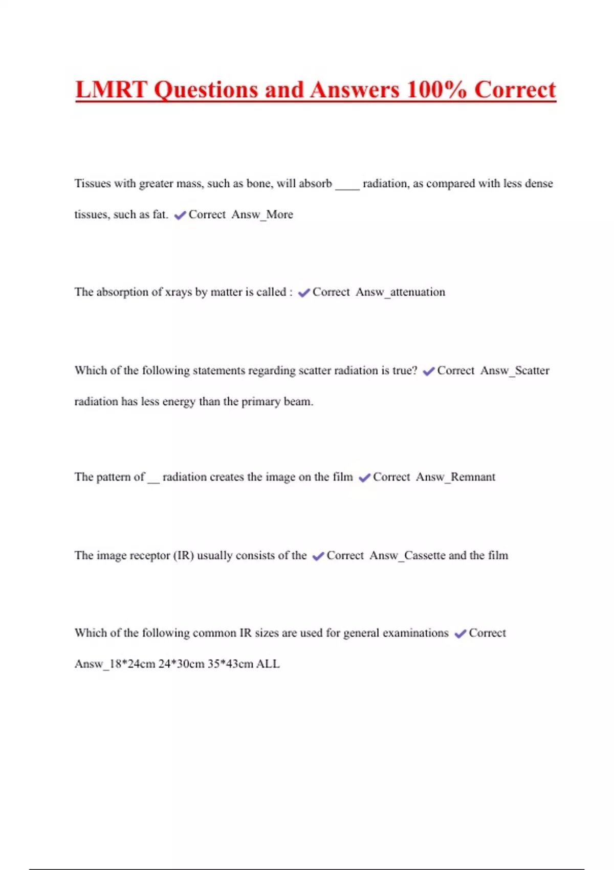 LMRT Questions and Answers 100% Correct Tissues with greater mass, such as bone, will absorb ____ radiation, as compared with less dense tissues, such as fat. Correct Answ_More The absorption of xrays by matter is called : Correct Answ_attenuation Which of the following statements regarding scatter radiation is true? Correct Answ_Scatter radiation has less energy than the primary beam